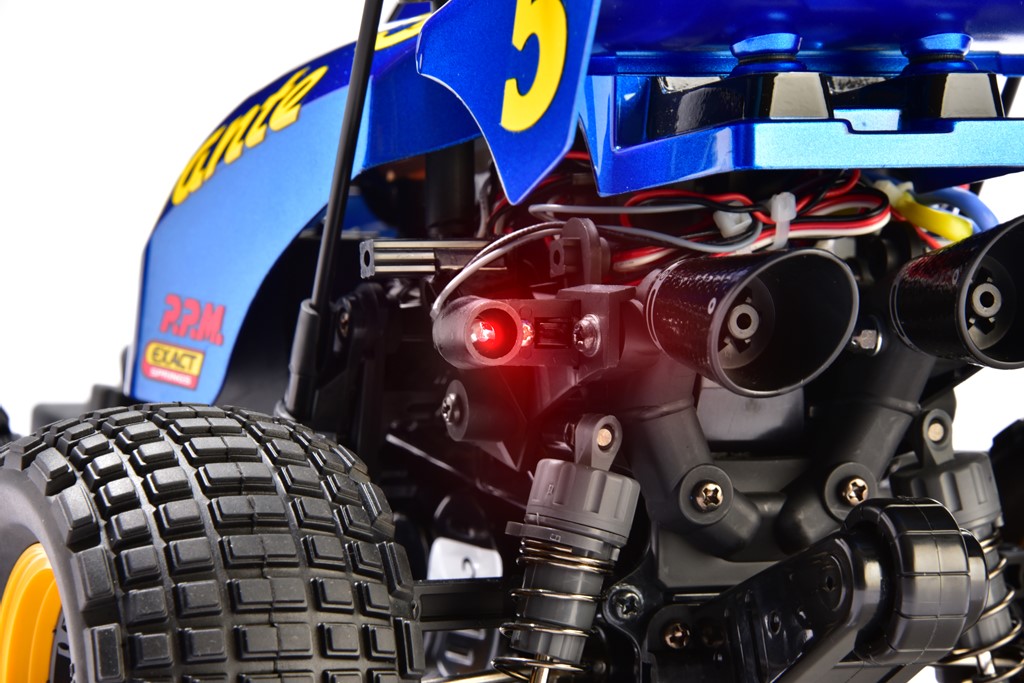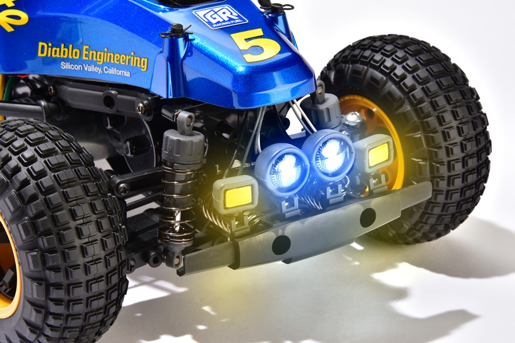 ラリー仕様にできるライトが付属。こちらにオプションで販売されているLEDユニットを取り付ければラリー仕様に。今回はリア部分にもLEDを取り付けてみた。そのほかのウイリーシリーズ(WR-02、GF-01)の豊富なオプションパーツも流用可能。自分なりのマシンに仕上げる楽しさはカスタム好きにはたまらない!