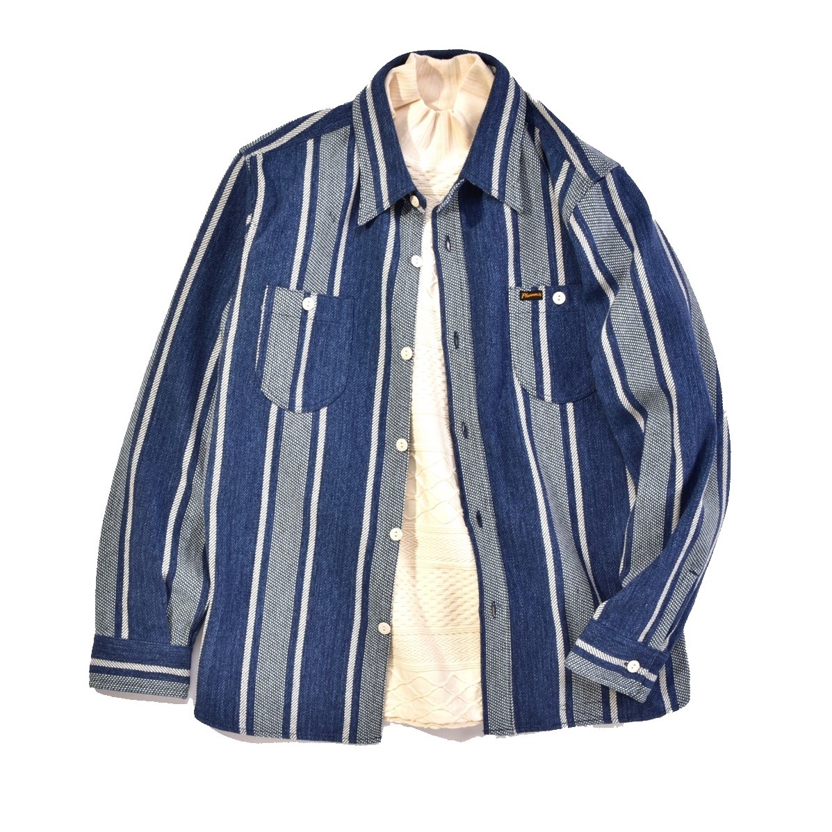 毎年様々な柄を提案するフェローズのコットンネル(1万8480円)。今季は珍しいストライプ柄を展開している。インナーにはケーブル柄をジャカード織で表現したユニークなロンT(1万3200円)差すことで温かみのある着こなしとなる。(フェローズ TEL03-5725-9577)