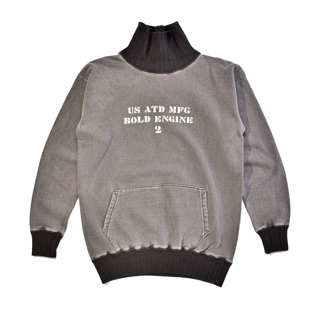 軍用トレーニングウエアに着想を得たハイネックスウェット。ヴィンテージライクな表情はピグメント加工によるもの。フロントのカンガルーポケットもグッドアクセント。2 万680 円(NO name! TEL078-333-1341)