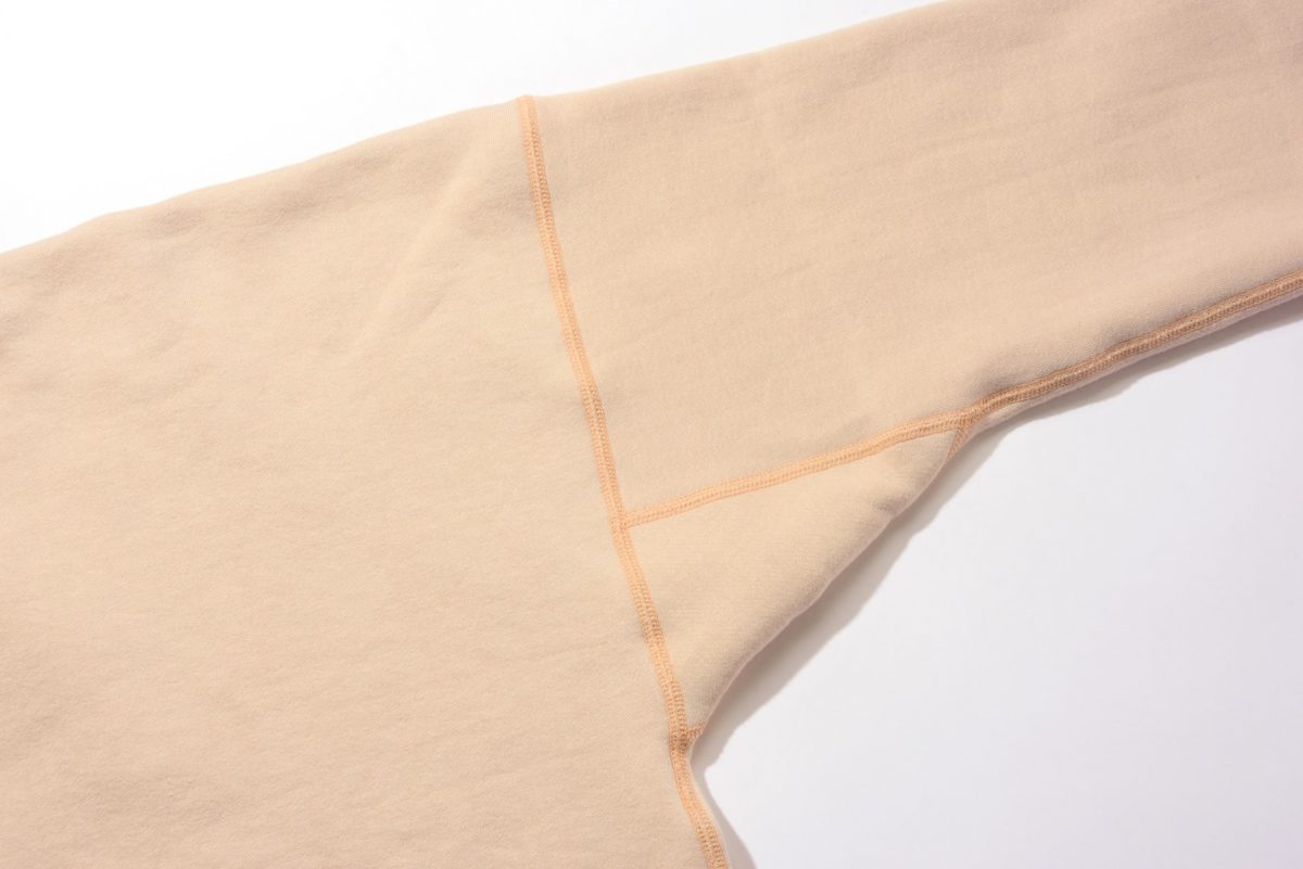 そんなオールドホームステッダーさんに先日イベントで再会したときに新作として見せてもらったのがこのコットンフリース。聞けばベースになっているのは日本で70年以上前に製作された輸出用の肌着をモチーフにしているという。そんな昔の肌着を見つけることもスゴイけど、そこから新たな発想が生まれるのもおもしろい。