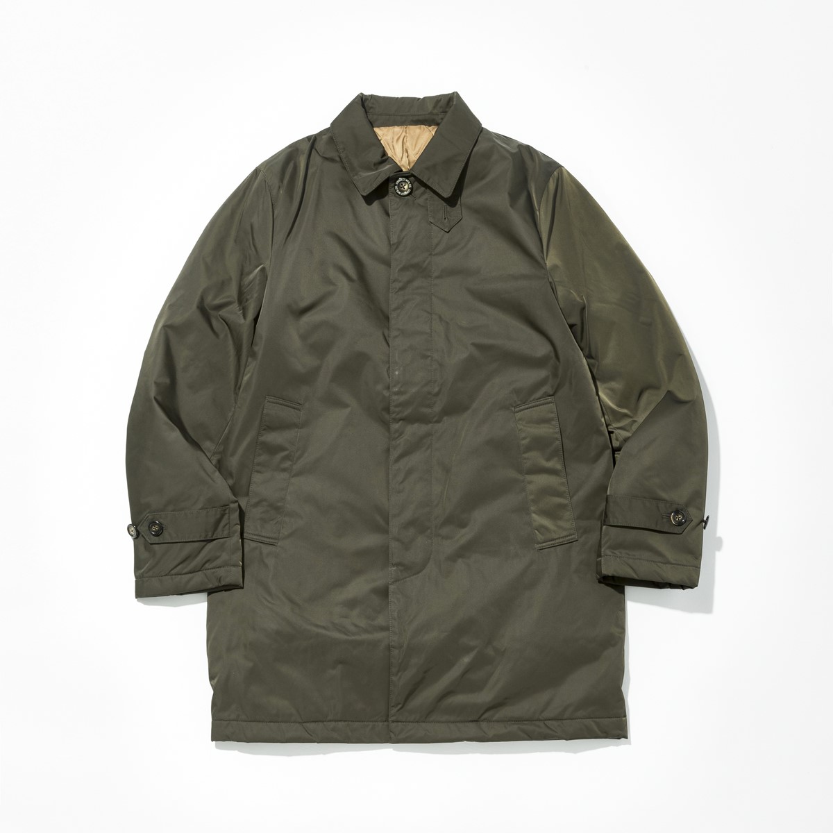 光沢感のある撥水生地で仕立てた綺麗なシルエットのステンカラーコート。中綿にはリサイクル綿をダウンのように加工した最新素材を使っているため軽量で保温性も高い。ミドル丈のシルエットなので、幅広い着こなしが楽しめそう!