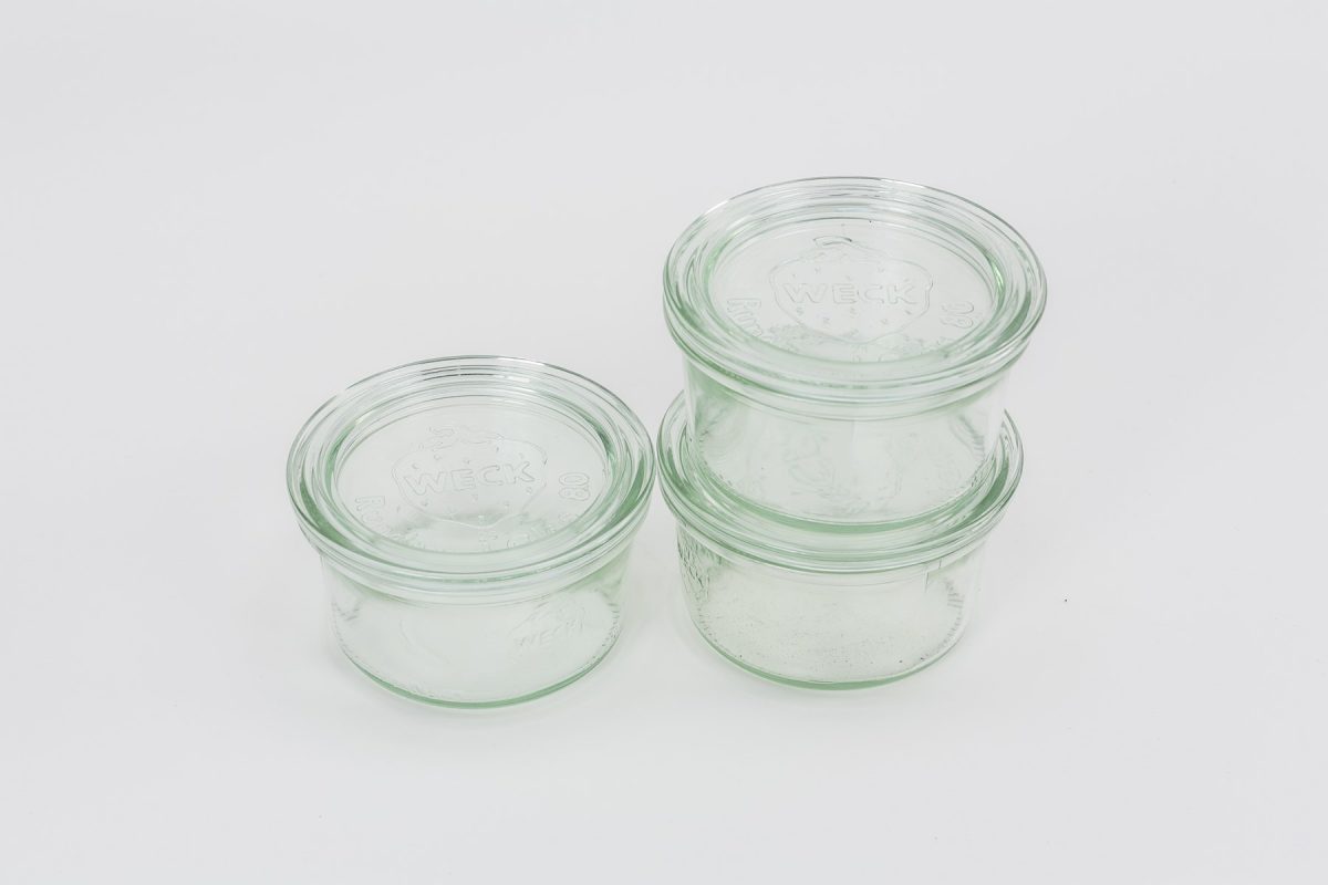 キャンドルの容器としてφ80 ㎜・165㎜のガラス容器を用意。透明なものを選ぶとキャンドルの色を楽しめる。各約500円