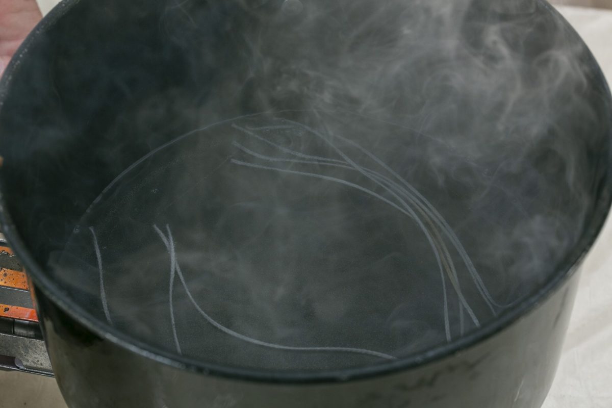 鍋に火をかけ蝋燭を5本入れて溶かす。強火にするとすぐに焦げてしまうので、弱火から少しずつ温めていこう。