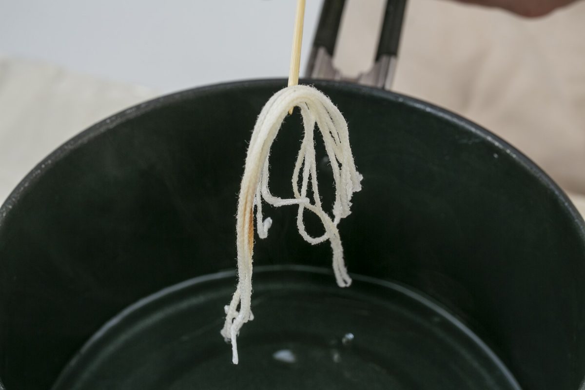 完全に溶けると芯が残るので取り出す。新しく作るキャンドルにこの芯を再利用するので、捨てずに保管しておく。
