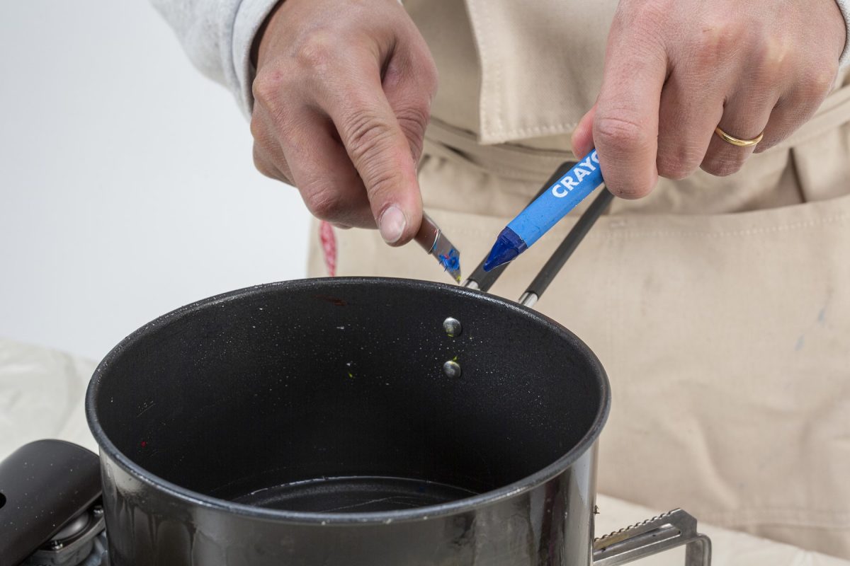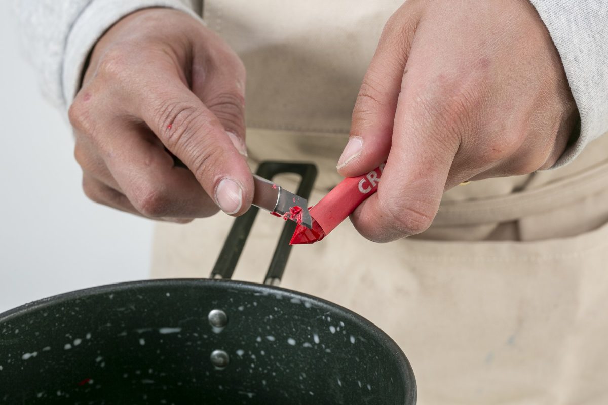 好みの色のクレヨンを削って蝋燭を色づけする。入れすぎると完成時に火の付きが悪くなってしまうので、蝋燭に対して0.1〜0.2%ほどの量を入れる。