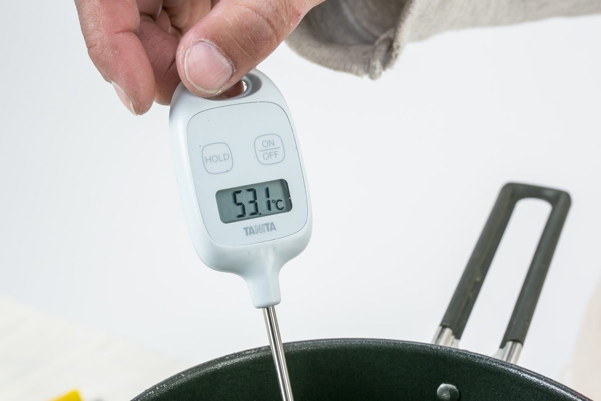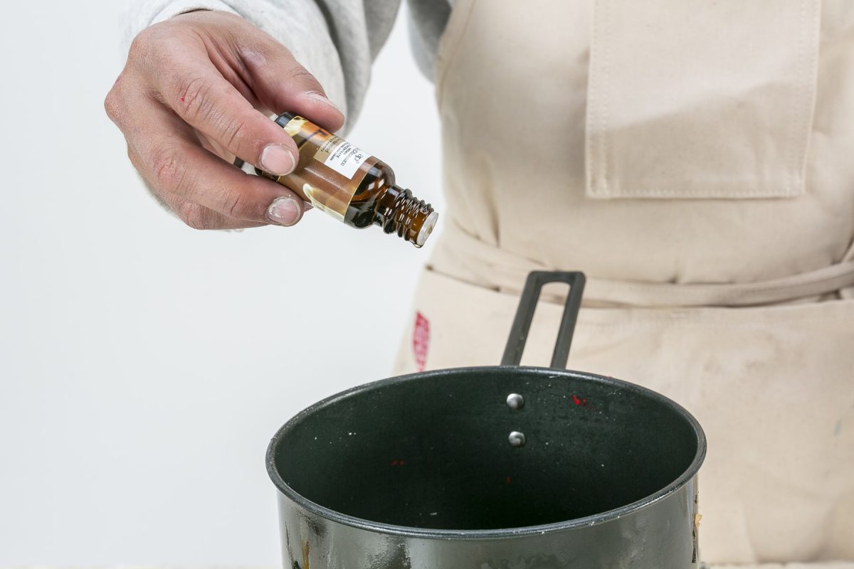 アロマオイルを数滴垂らす。蝋燭の温度が高いと揮発してしまうので、60度以下になってから入れる。