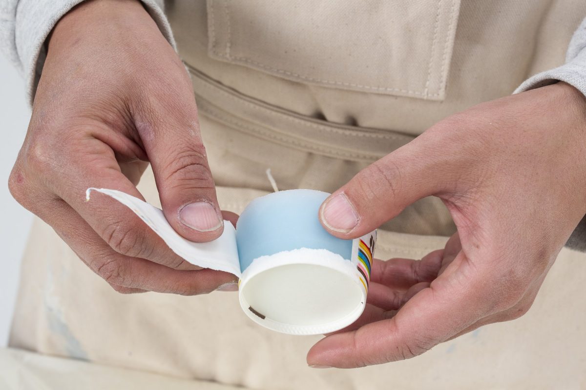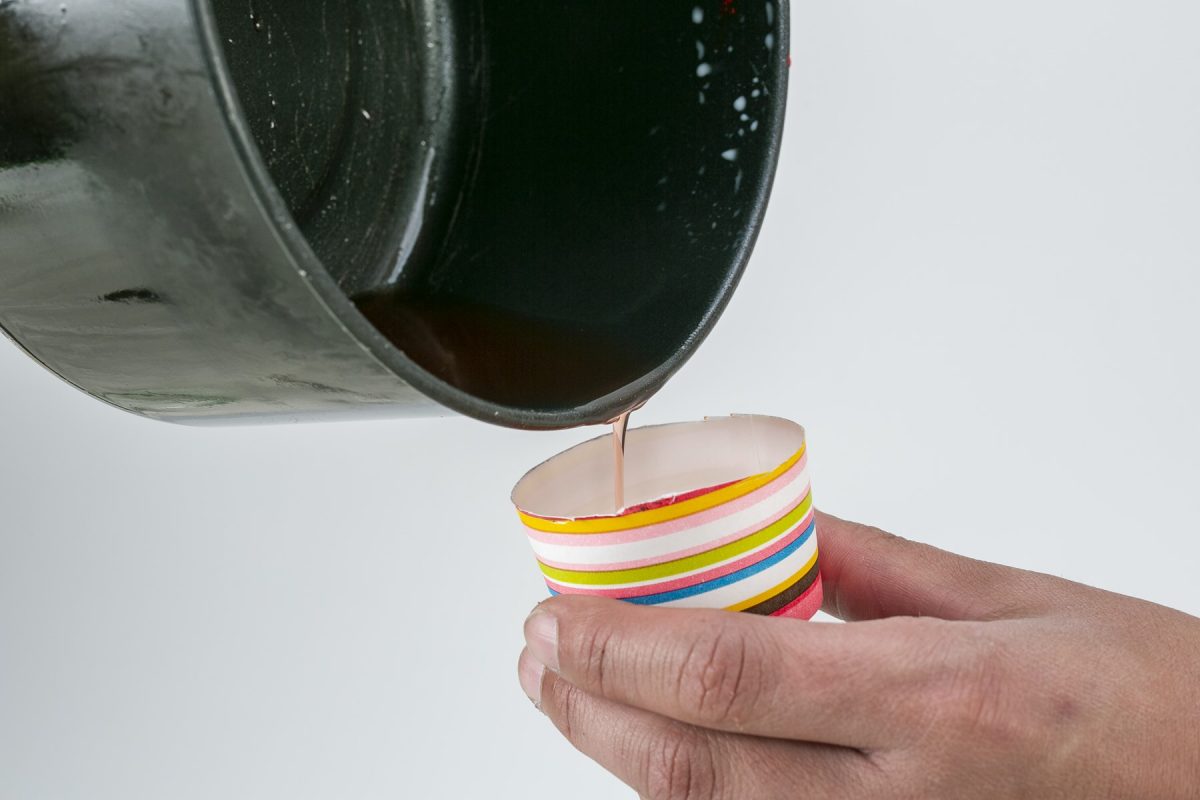 紙コップを適度な高さにカットして、溶かした蝋を流し入れる。まだ熱いので、火傷しないように注意しよう。