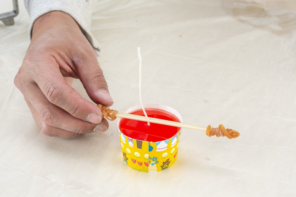 先ほど取り出した芯を竹串で挟み、輪ゴムで固定する。それを流し込んだキャンドルの中央にセットする。
