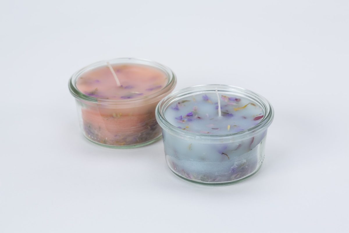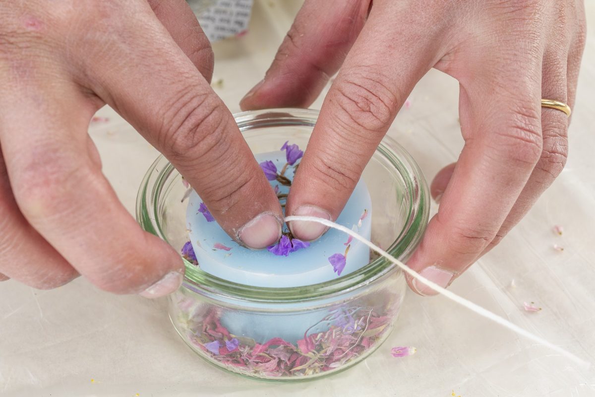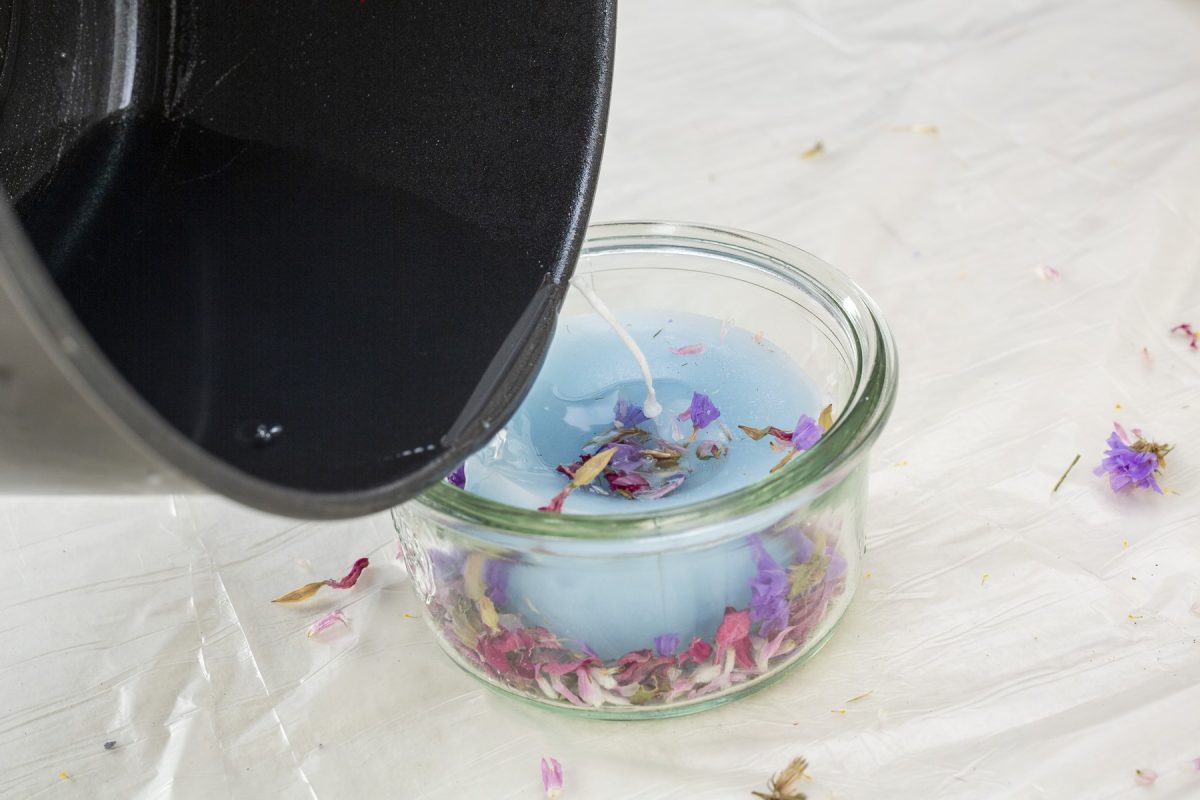 溶けた蝋をガラス容器に少しずつ流し込み、さらにドライフラワーを散らして固める。