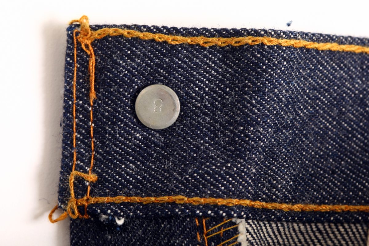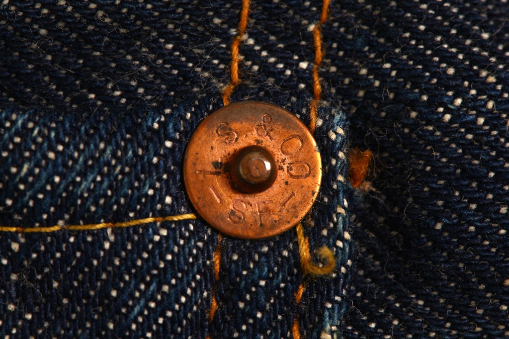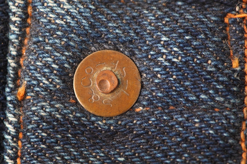 前述のようにリベット留めによる補強は、1873年に特許を取得した、いわばジーンズを象徴するもの。当初は下の写真のように平たく中央に叩いた痕のある形状だった。リーバイスはこの刻印である程度の年代判別ができる。