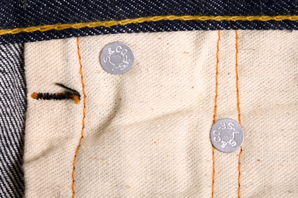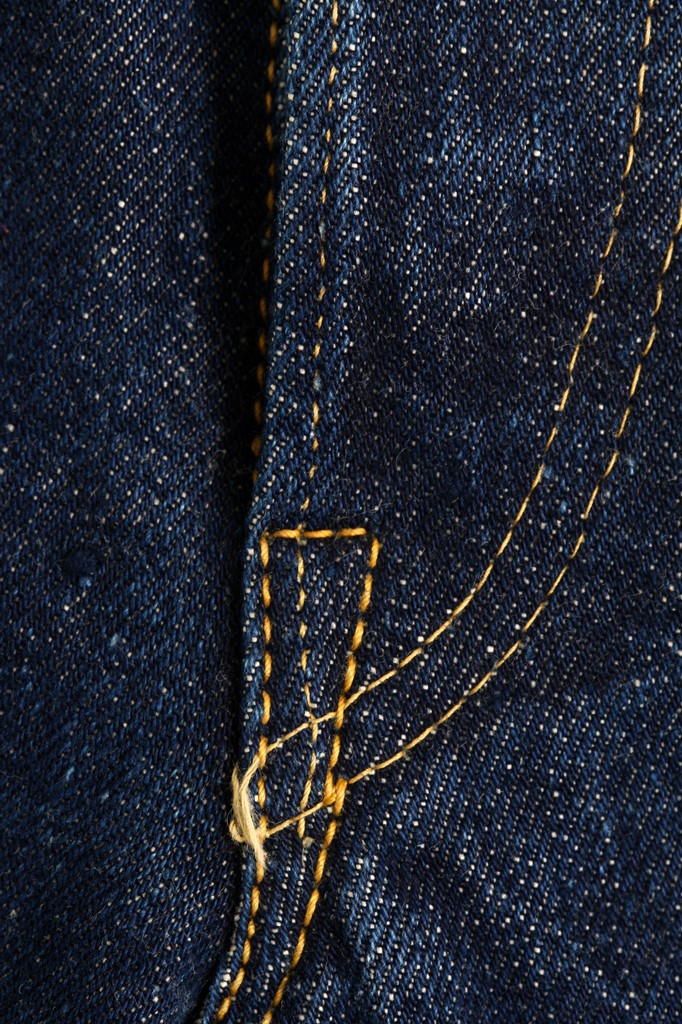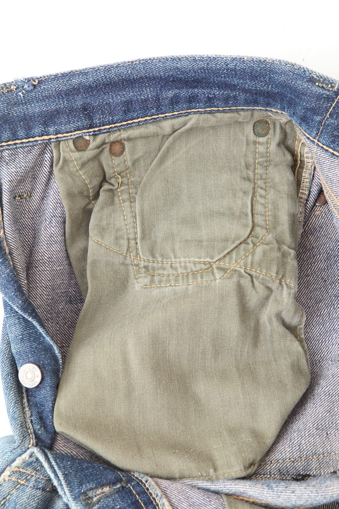 ウエスト周りの帯状のパーツをウエストバンドと呼ぶ。’30年代後半になると、この下側部分はチェーンステッチで縫製されるが、上部はシングルステッチ縫製のままで、’60年代後半から上部もチェーンステッチになる。