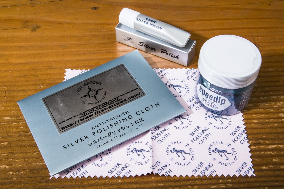 硫化と呼ばれる化学反応で黒ずんでいくシルバー。その黒ずみを除去するクリーナー。コンパウンドのポリッシュ、拭きあげるクロスがあれば充分だ。クリーニングセット¥2,