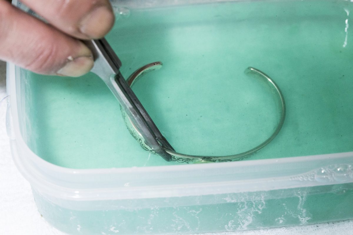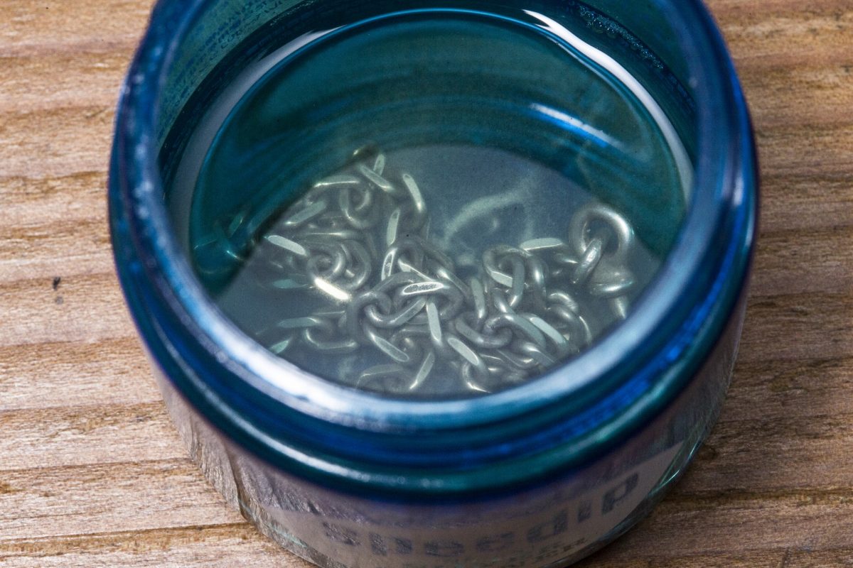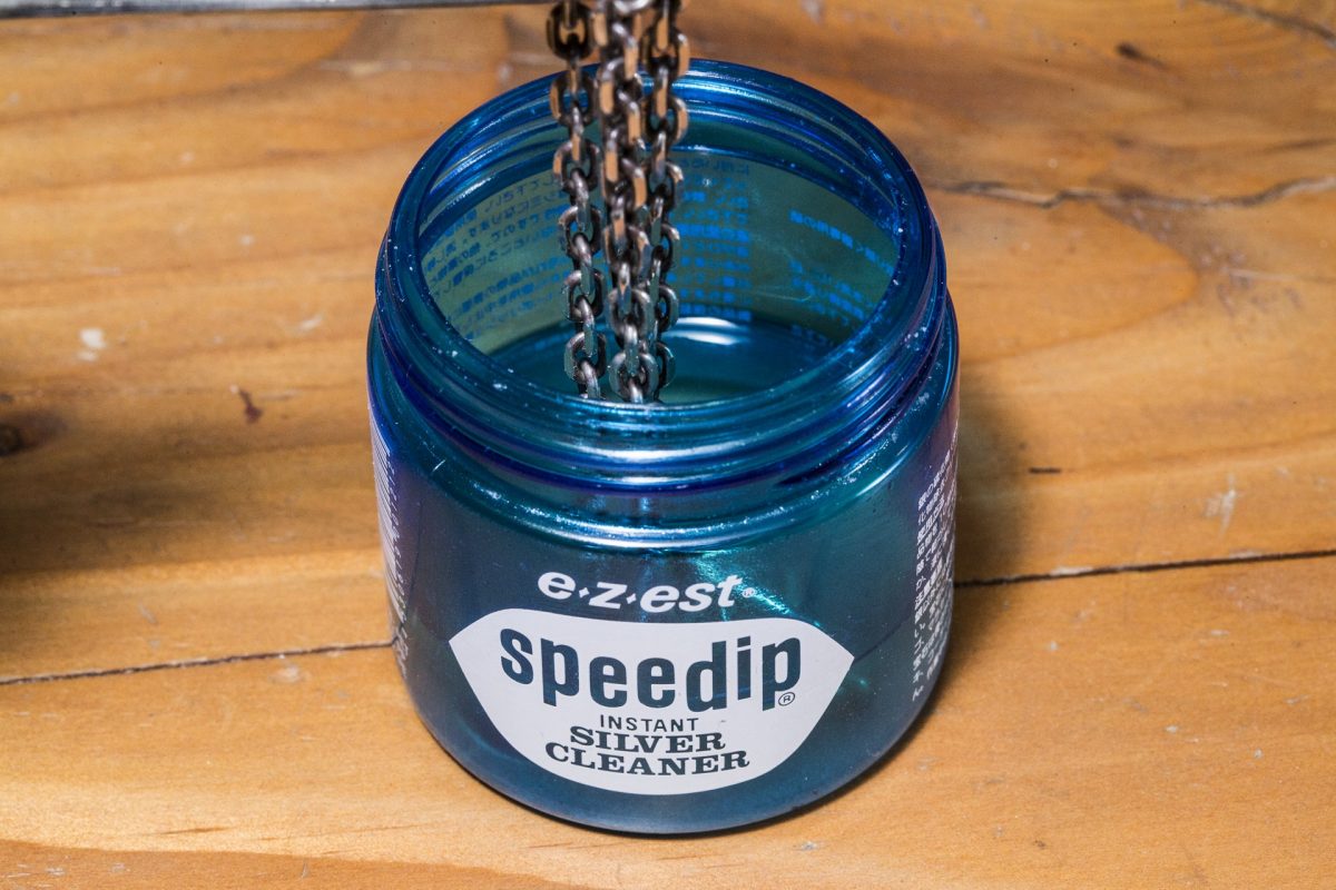 大きめのアクセサリーでも洗浄方法は同じ。トレイに洗浄液を入れ浸すだけで、ほとんどの黒ずみは化学反応により落とされていく。こぼしてしまうと大変なので、無理して小さな溶液に浸そうとせずにトレイに移そう。水洗い後、コンパウンドで仕上げればOK。