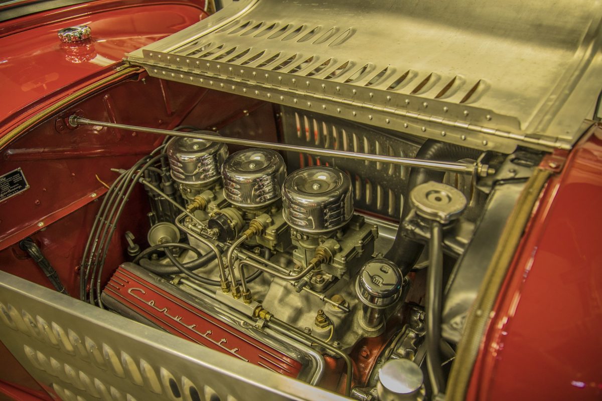 エンジンはシボレーの283V8にキャブレターを3基セットするクラシカルなスタイル。ベアメタルのエンジンフードの周囲にあしらわれたルーバー(262個)にやる気を感じる。