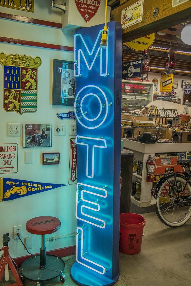 こちらは、1950年代にニュージャージー州のモーテルで使われていたというネオンサインをスワップミートで手に 入れたという代物。今ではガレージ入口のアイコンに。しっかりサインも光る。