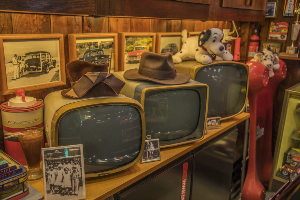 きれいに陳列されたRCAビクターのテレビはよく見ると上部にハンドルが付いたポータブルモデル。といってもかなり大きいのが時代感だが、聞けばどれも1956年製。当時としては最先端の家電だった。その後ろに飾られた旧い写真も雰囲気たっぷりである。