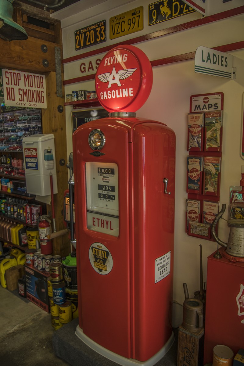 アメリカでは収集家も多いヴィンテージのガソリンポンプはレストアされているので新品同様のクオリティ。上部のランプもしっかりと点灯する。アメリカのガレージにはこれがよく似合うのだ。