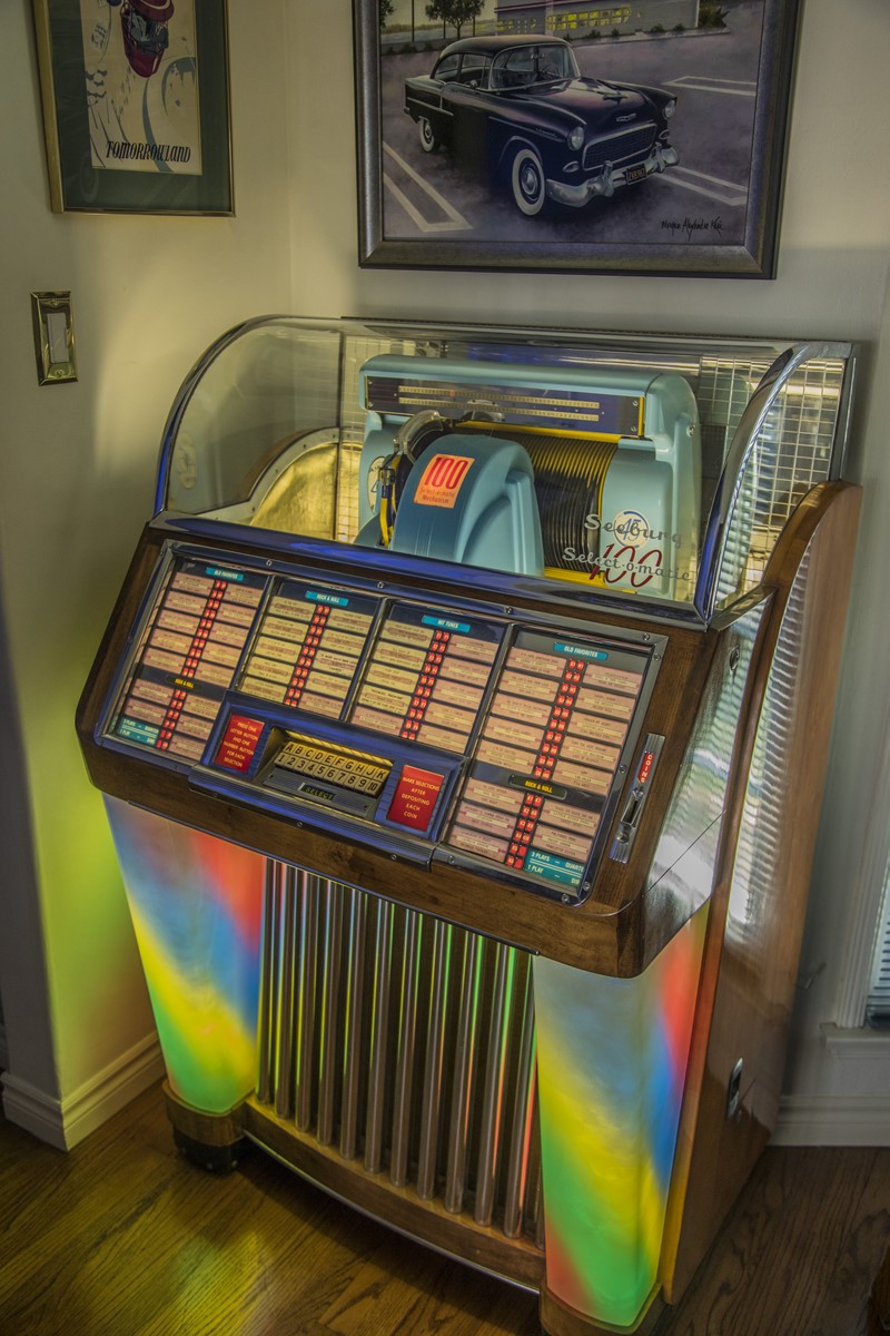 ガレージに置きたいものランキングに必ず入る(と思っている)ジュークボックスも。ヴィンテージでも汚れたアイテムではなく、新品同様にレストアされたモノが好きなジェリー。往年のジュークボックスはシーバーグ社製で、当時としては画期的だった100連装モデル。1990年に個人売買で手に入れたというストーリーがある。