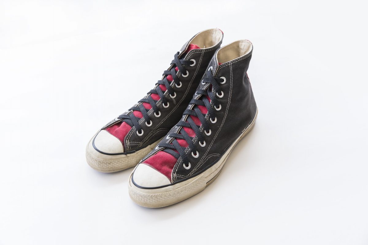 通称銀箱と呼ばれる1980年代のコンバース・オールスターも。かなり珍しいブラック×レッドの2トーン。コレクターズアイテムだ。4万9900円