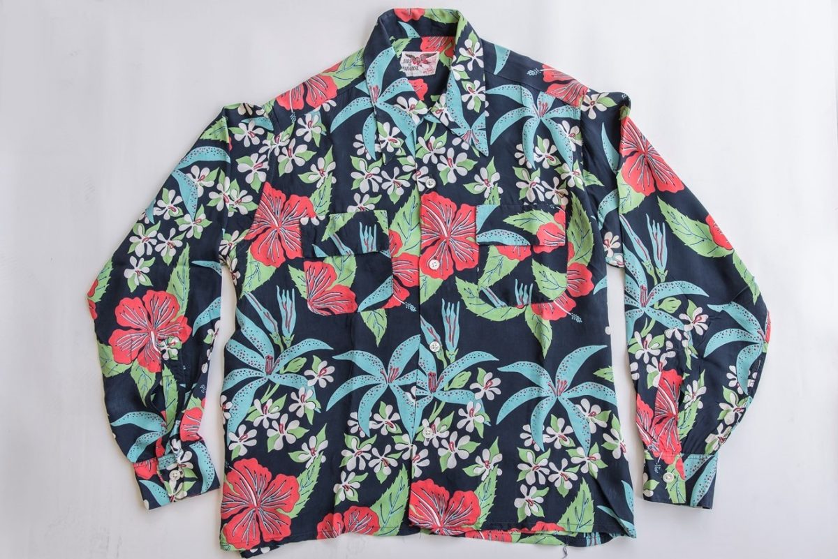 こちらのネイビーベースのロングスリーブのアロハシャツは、人気メーカーであるバード・オブ・パラダイス。デザイン、コンディションともに◎。3万9900円