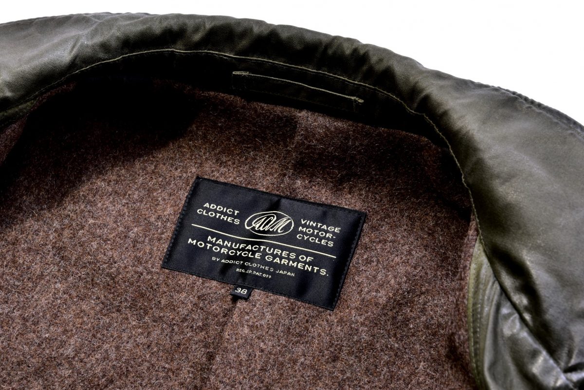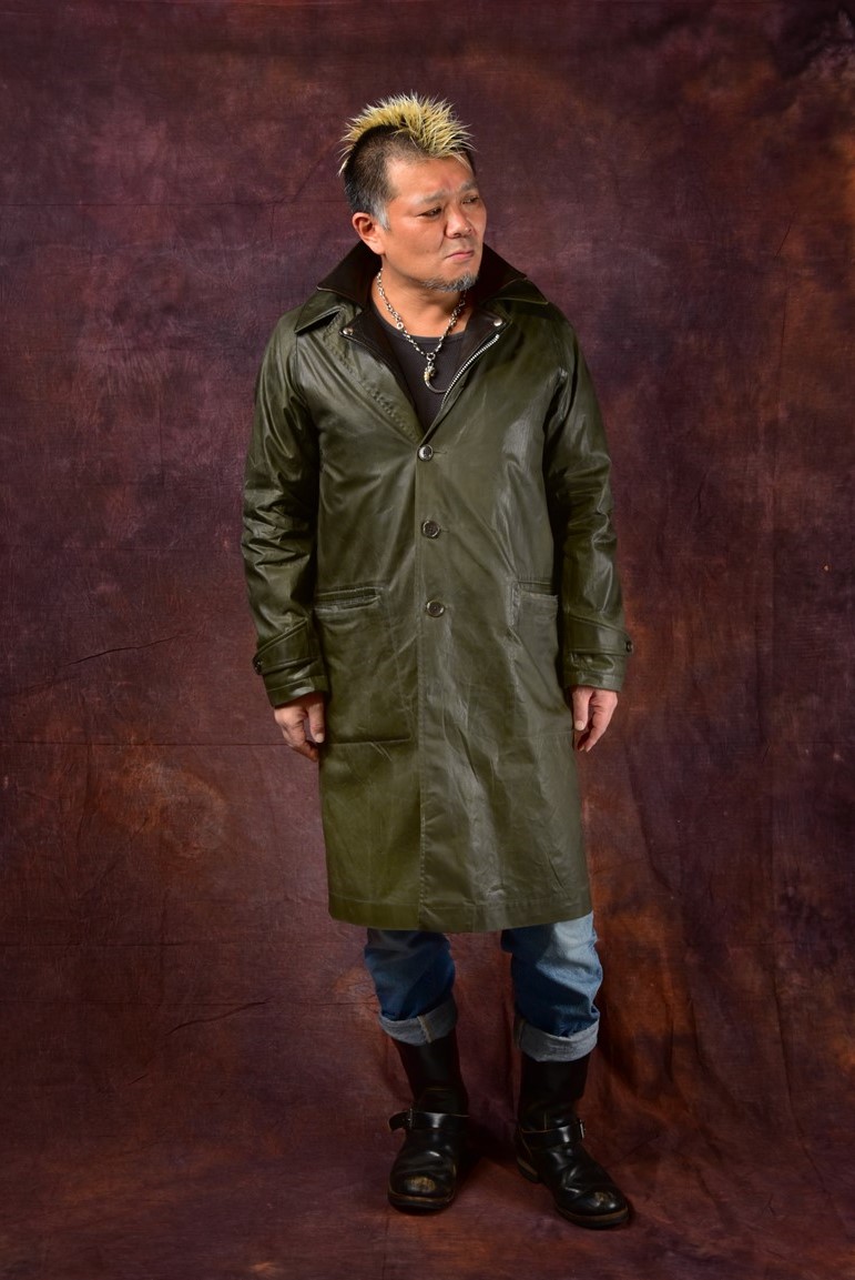 旧いディスパッチコートをベースに、アディクトクローズがオリジナルで開発したワックスコットンを採用して再構築。遮風性も高く、裏地はウール素材で、真冬の強い味方だ。モヒカン小川は、ライダースの上から着用している。11万円