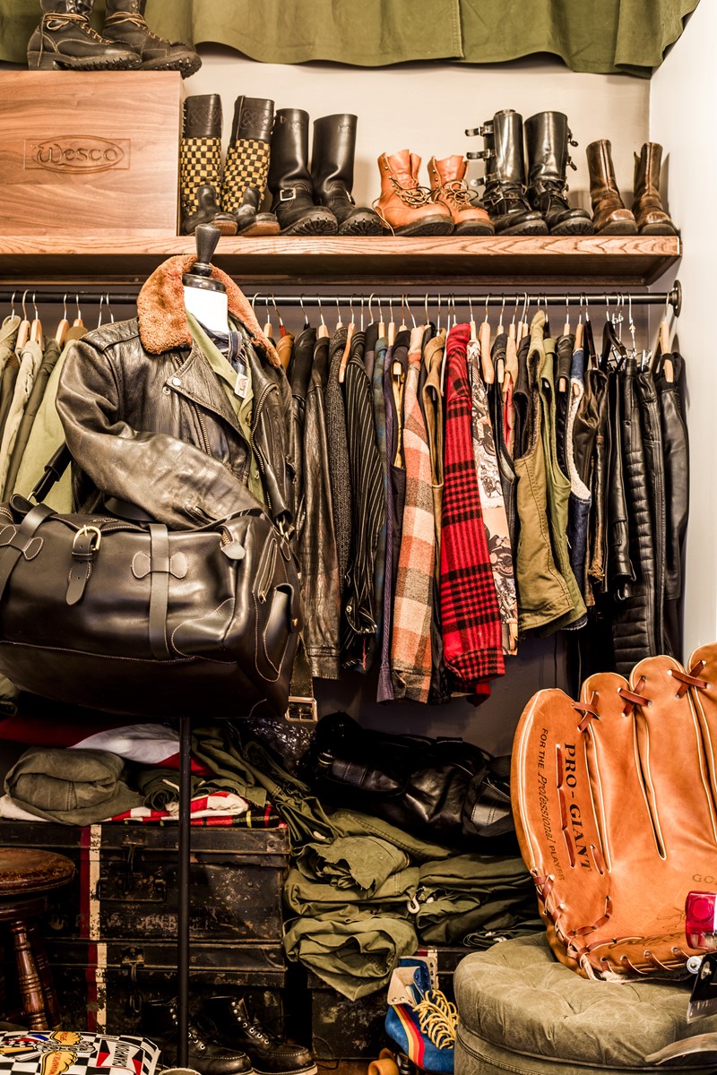 ヴィンテージショップが開けるほどのクローゼット。よく見るとミリタリーとレザーアイテムで構成されるバイカーセレクトであるのがわかる。