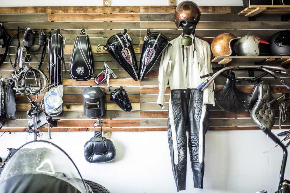 洞窟と呼ぶには広すぎるかもしれないけれど、ここで10台ものバイクとあふれんばかりのヴィンテージギアに囲まれているのがジョンさんにとっての至福の時間だ。