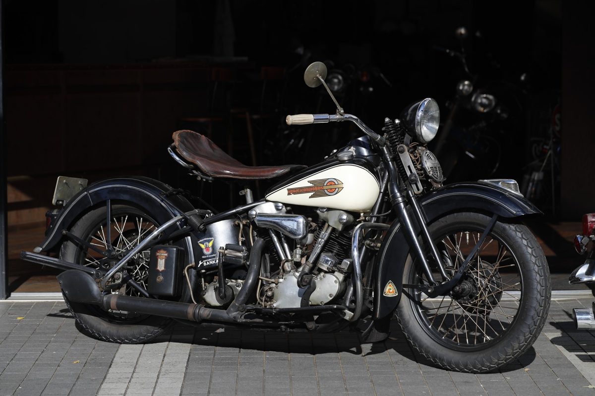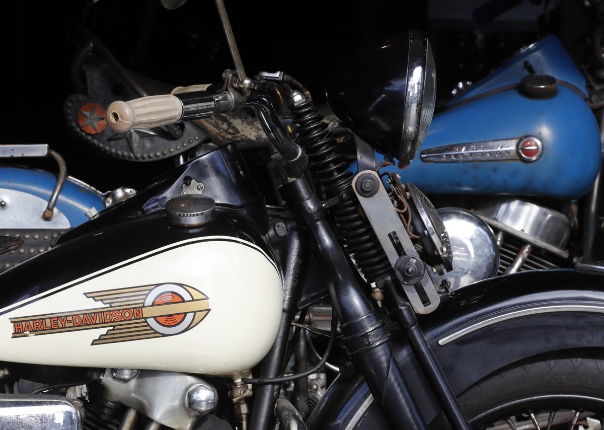 手前が’39年のナックルヘッド(リペイント)、奥が’50年のパンヘッド。’39年まではタンクグラフィックがデカールで、’40年から立体的なエンブレムが付くと覚えておくと年式判別しやすい。もっと深く知りたい人はそれぞれの年式のタンクグラフィックを調べてみると面白い。