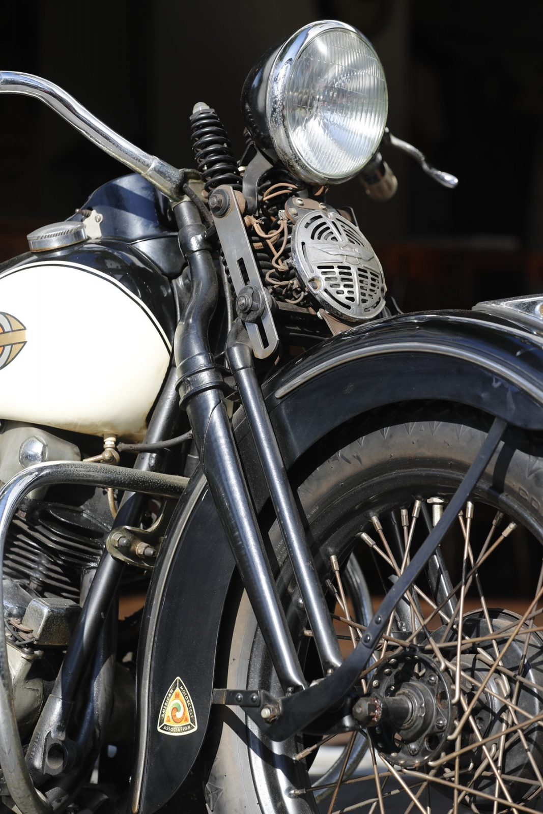 ヴィンテージハーレーと聞いた時に多くの人がこのフォークが付いている形を想像するはず。スプリンガーフォークと呼ばれるもので、’48年まで純正採用されていた。後ろのレッグが動き、バネの力だけで衝撃を和らげるもの。見た目は明らかにクラシカルでカッコイイが、大きなギャップをひろうとしばらくフワフワし続けるので、乗り味の好みは分かれるところ。