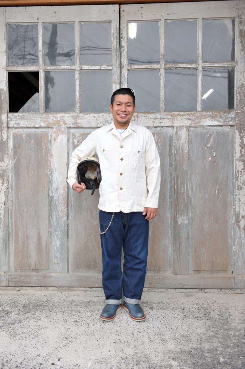 中学生の時からヴィンテージ好きだったという山口康識さん。ヘルメットはBell の500TX。Lee のカバーオールにビッグE。全身ヴィンテージである。