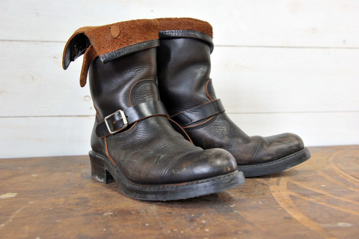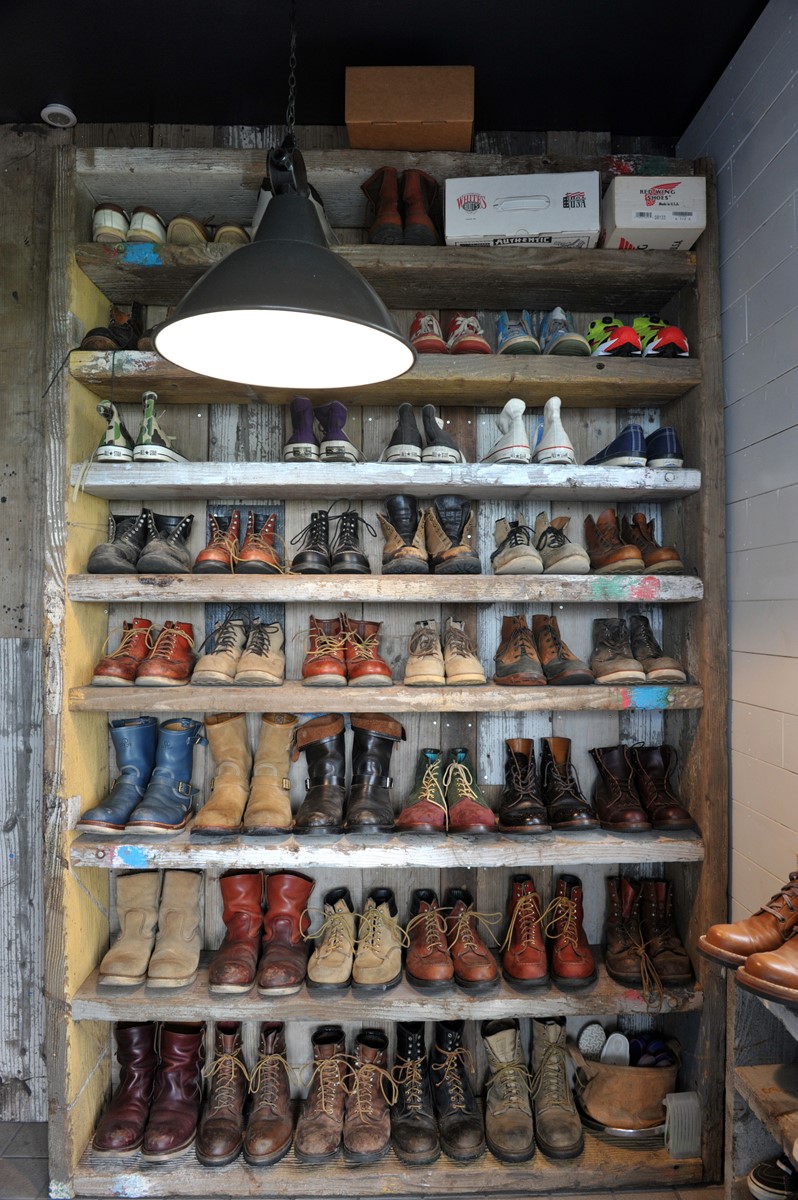 山口さんのシューズケース。各社のブーツを履きつくしているのは一目瞭然である。ちなみにシューズケースは山口さんの本業となる手仕事である。