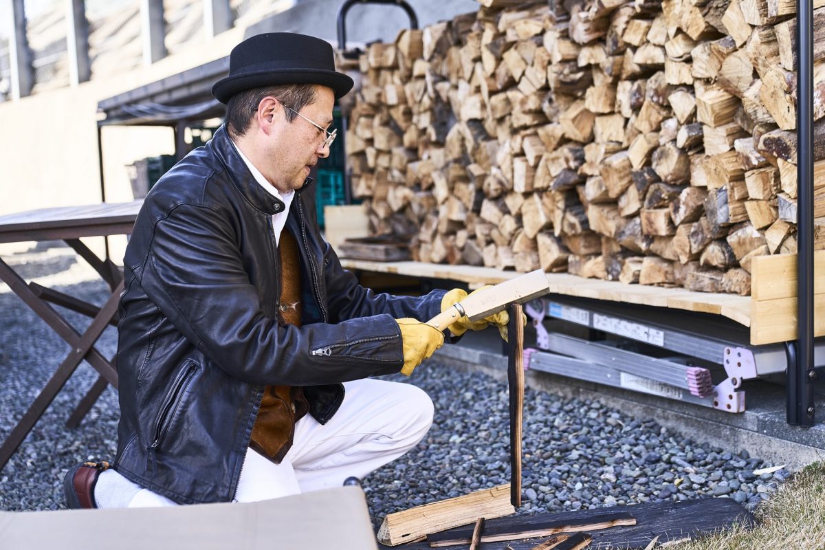 「家でも焚火状態」 これぞ理想の暮らし。薪割りも楽しいひと時だ。