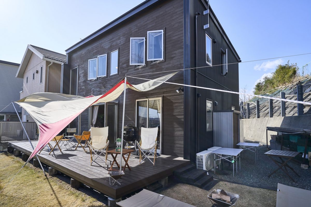 ウッドデッキにはタープが張られ、庭にはBBQグリルや焚火台も設置されており、大好きなアウトドアライフを、自宅に居ながらにして楽しんでいる山本さん。