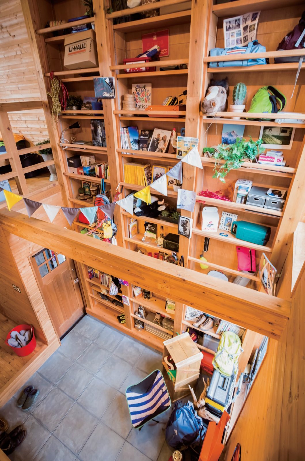 こちらも同じく「ワンダーデバイス」の吹き抜け部分を利用した、天井まで貫く「ハシゴde本棚」。写真のように、本だけでなく趣味の道具をディスプレイすれば、自分だけのギャラリーに!