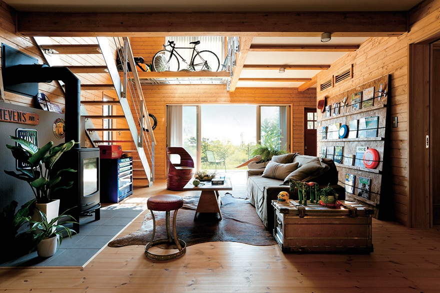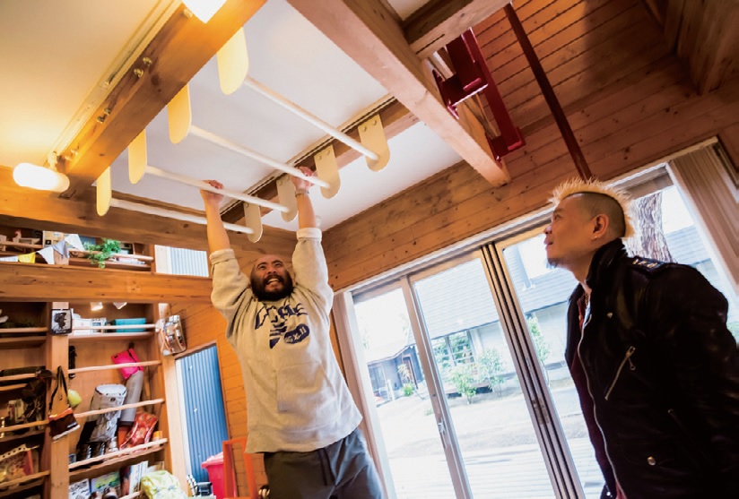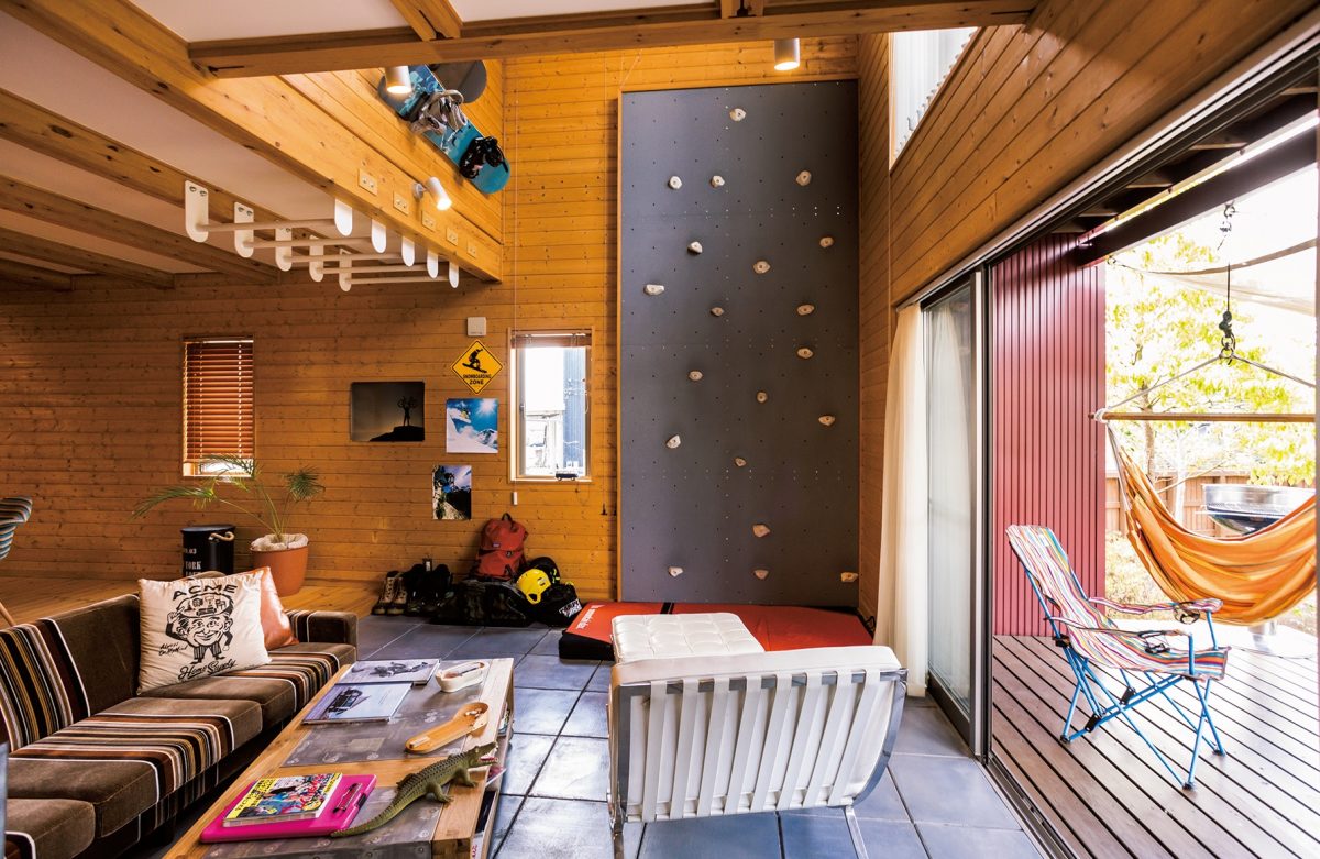 「BESS」の家の三種の神器ともいえる「土間」「ウッドデッキ」「薪ストーブ」。これだけでも、なかなか個性的で遊べる家だが、「BESS」オーナーのなかには「うんてい」「ボルダリング」「登れる本棚」なんていう、家のカスタムではなかなか聞かないものを設置している人も多い。