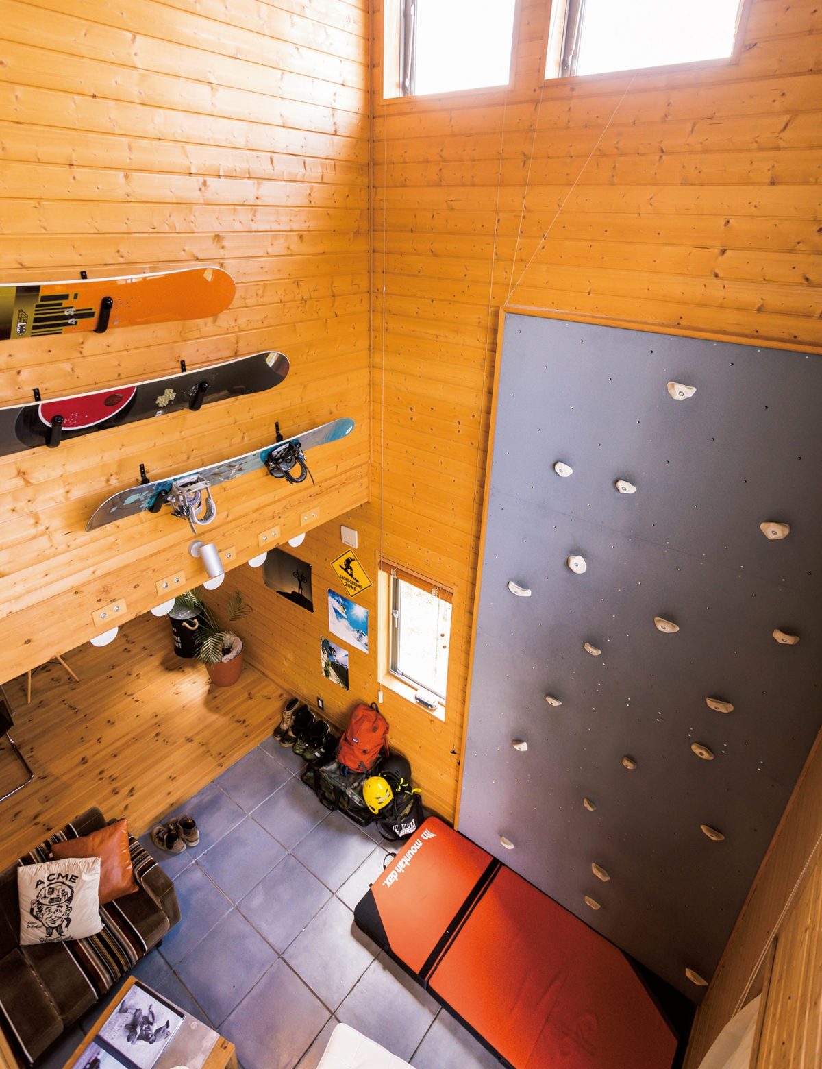 2階から吹き抜けを見下ろすとこんな感じ。設置されたクライミングウォールの存在感はハンパない!
