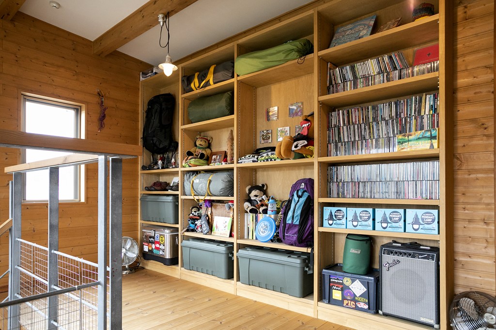 この子どもたちの勉強スペースのあるロフトの手前、階段をあがってすぐにあるスペースには造りつけの棚があり、趣味のアイテムを収納。まさに住む人がどう使うか考えたスペースの活用術だ。