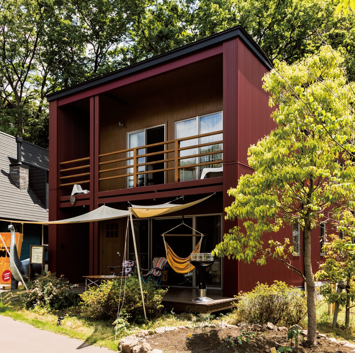シャープな印象のガルバリウム鋼板の外壁と、ウッディな雰囲気が絶妙な調和を見せる「ワンダーデバイス」のスタイリッシュな佇まいは、自然の中はもちろん、都市部でもマッチする。写真はレッドだが、ガルバリウムはブルー、ブラック、グリーンなどからチョイスすることが可能で、外壁の色を取ってみても自由度が高い。