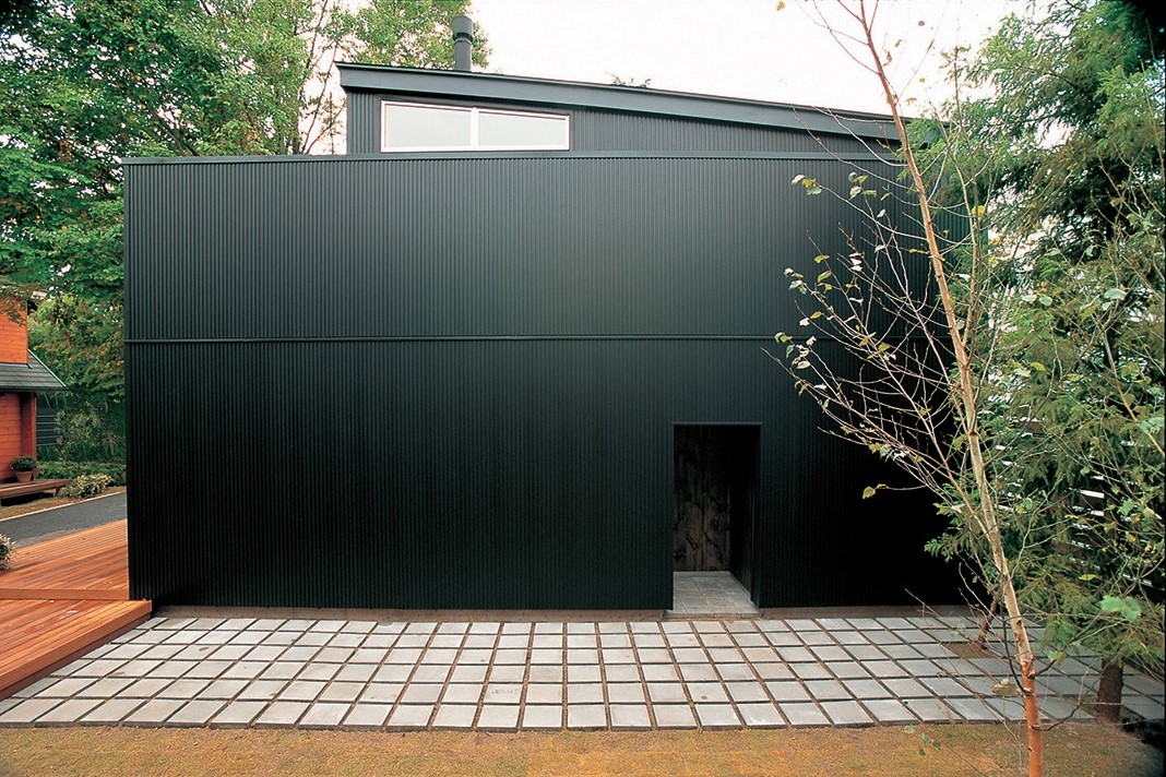 一方こちらの正面が真っ黒なガルバリウム鋼板に玄関ドアがひとつという、なんともスタイリッシュさがひと際目を引く建物。こちらも「ワンダーデバイス」なのだ。