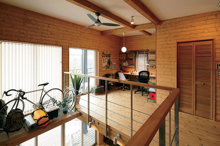 一方こちらは、ロフト部に机を置いて、趣味部屋っぽく利用。十分な広さがあるのでリビングとしても、書斎や趣味部屋としても活用可能だ。天窓からも日が差し込み、明るい空間が広がる。