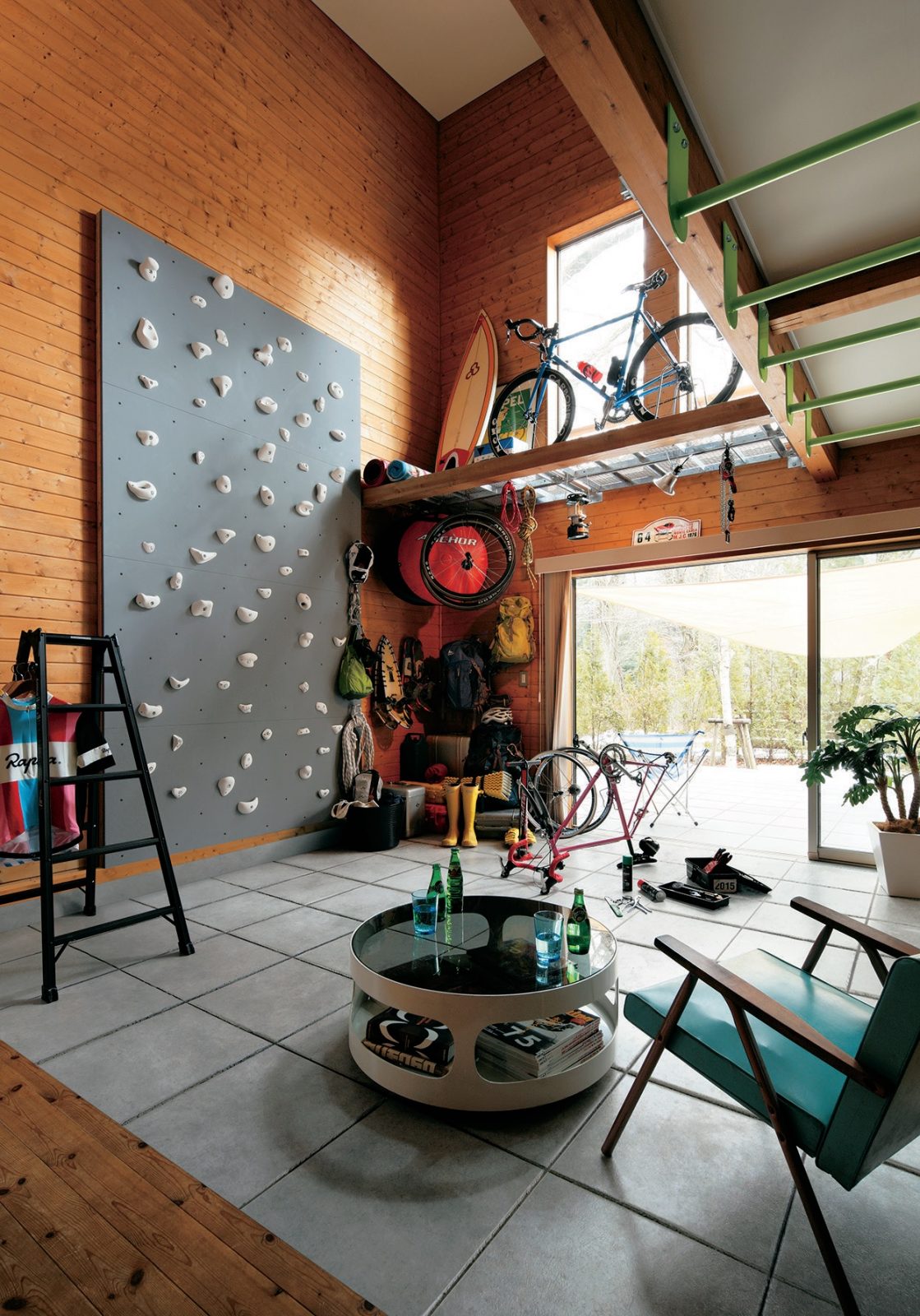 こちらの土間をふんだんに設けた「ワンダーデバイス」では、吹き抜けを利用したクライミングウォールを設置。趣味のロードバイクのメインテナンススペース、ちょっとしたくつろぎのスペースを確保してもこの広さだ。