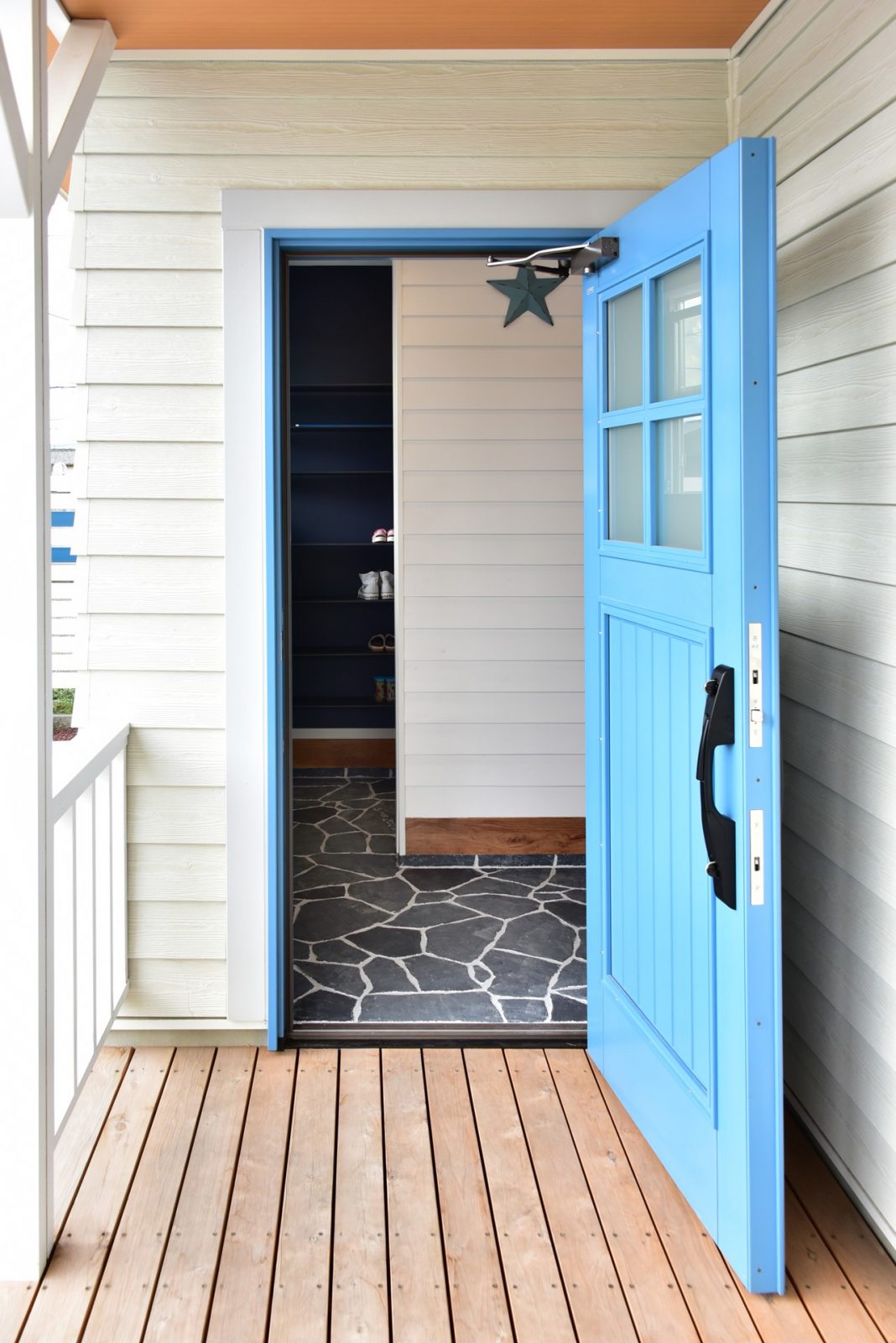 ライトブルーのドアを開けて玄関へ。中央に間仕切りを設置して、奥にシューボックスを設置。
