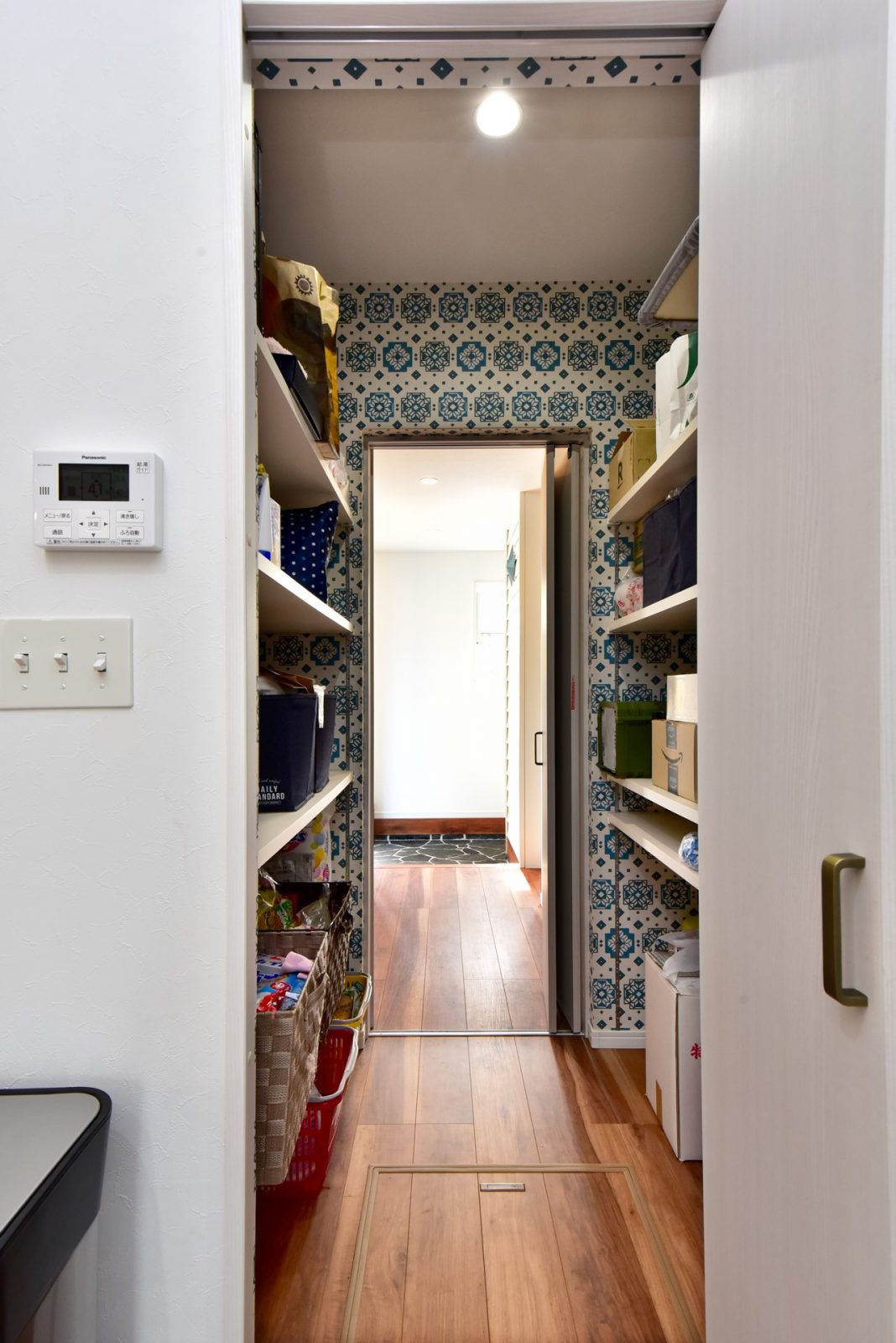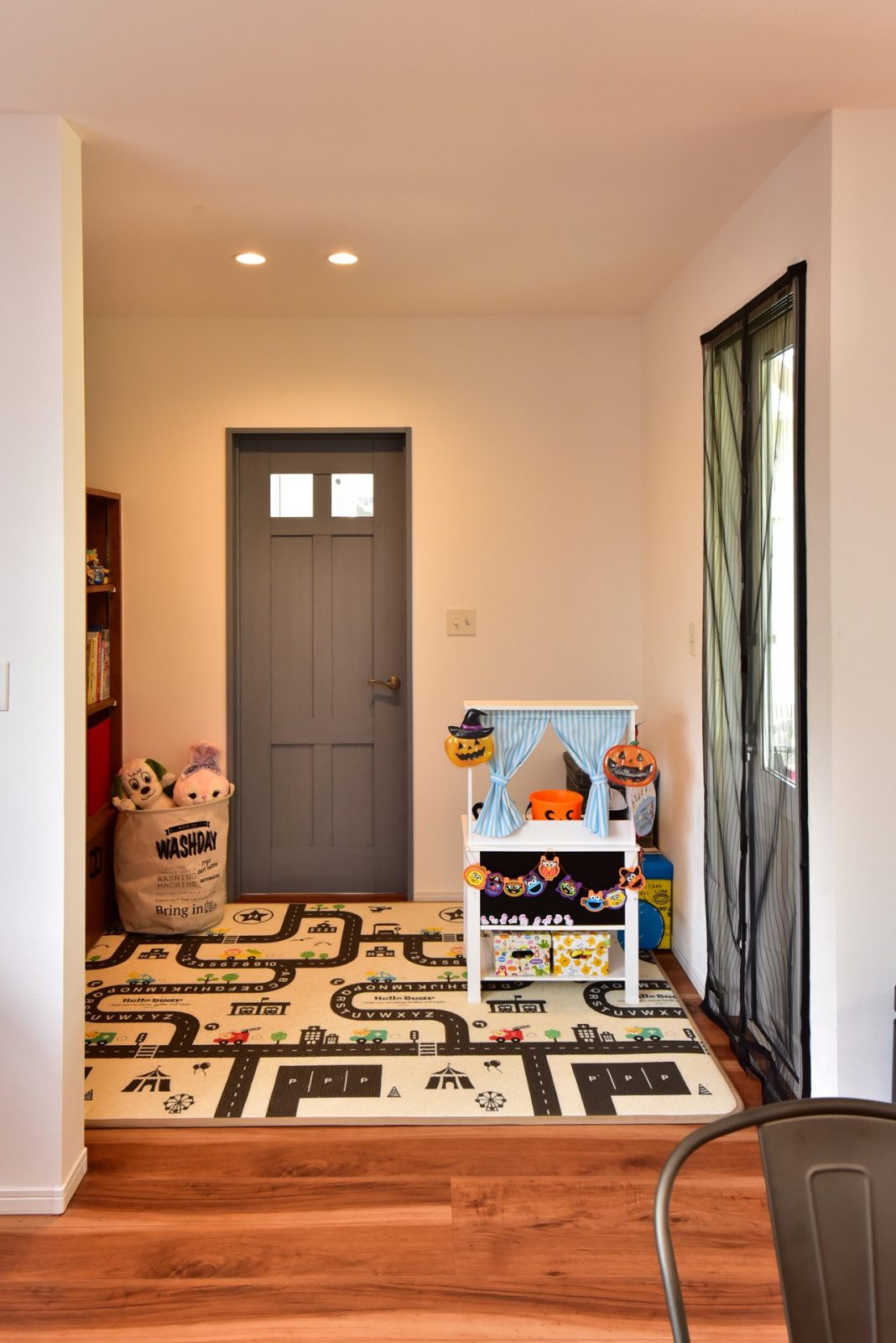 キッチンから一望できるキッズスペース。奥の扉を開くと、店舗へと繋がる廊下が現れる。仕事場へのアクセスは約10秒。