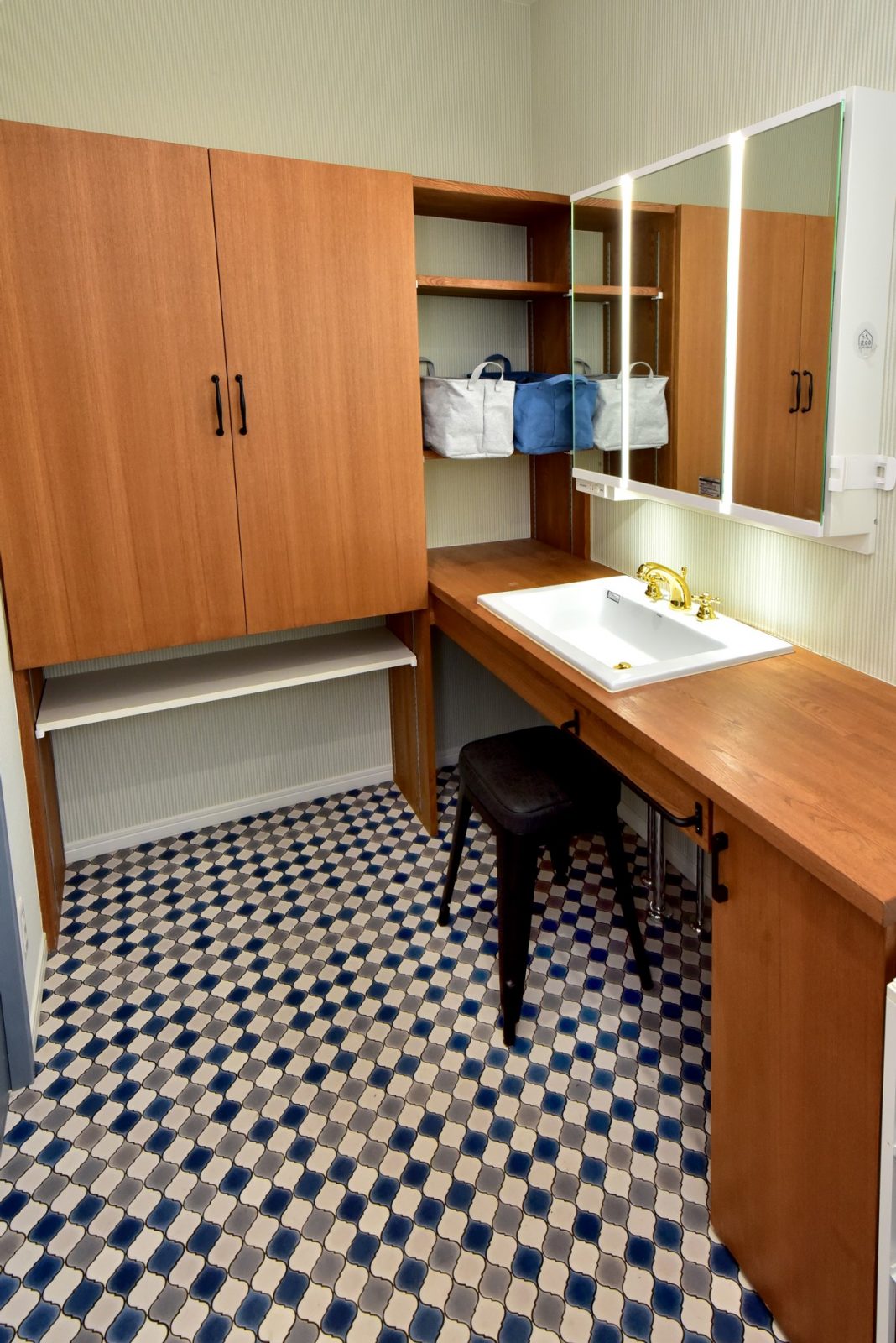 作り付けの洗面台は、とても広く収納たっぷりで使いやすそう。床のタイルがより明るい雰囲気に。