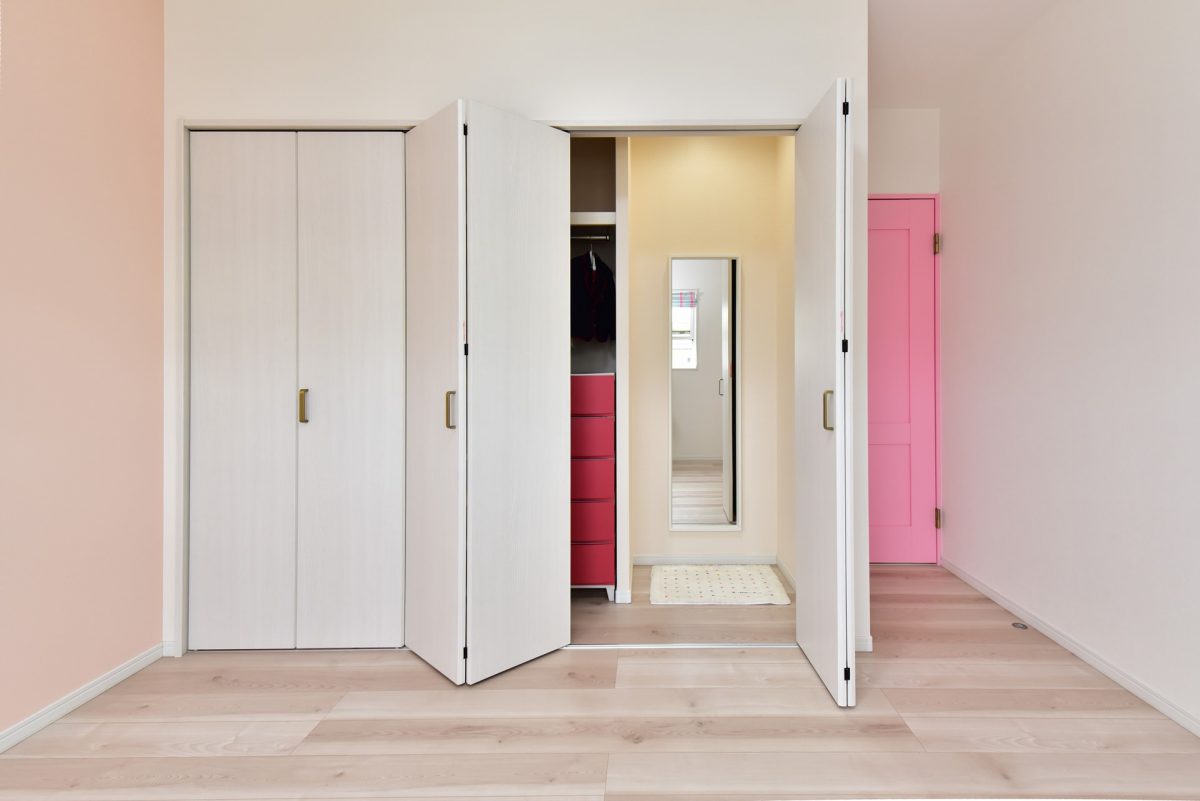 こちらは娘さんの部屋。使用している木材の色味やピンクのドアや壁など可愛らしい雰囲気に。