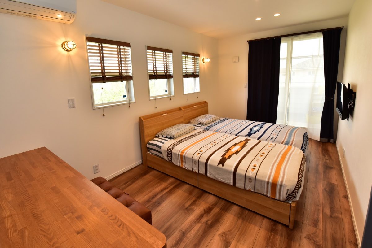 落ち着いた雰囲気の寝室。3つの小型窓が空間を演出している。ベッドサイドには、カウンターテーブルを設置して使い勝手も◎。