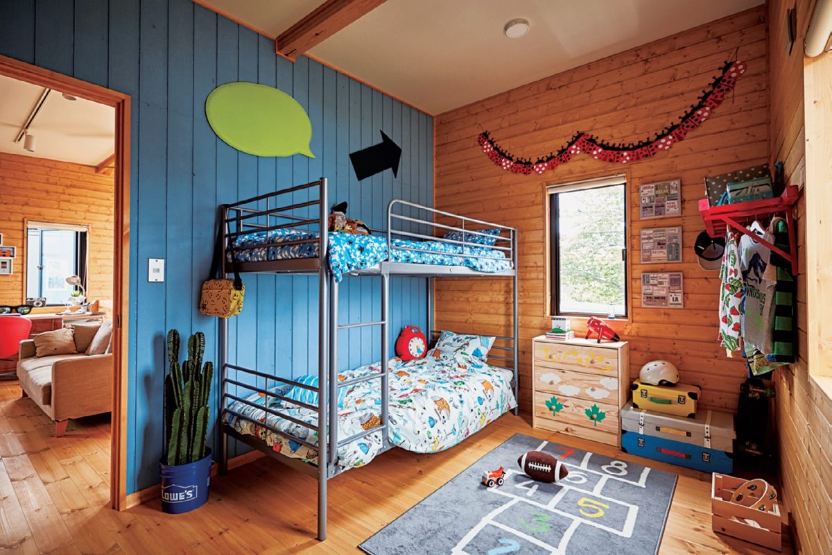 部屋を仕切る無塗装のボロックス合板なら、ペイントだって自由自在。お好みのペンキで塗っちゃうのが吉。例えば、大胆に1階リビングの壁面は鮮やかなグリーンでペイント。子供部屋はブルーで海をイメージしてペイント。ピンクやイエローなど、可能性は無限大。