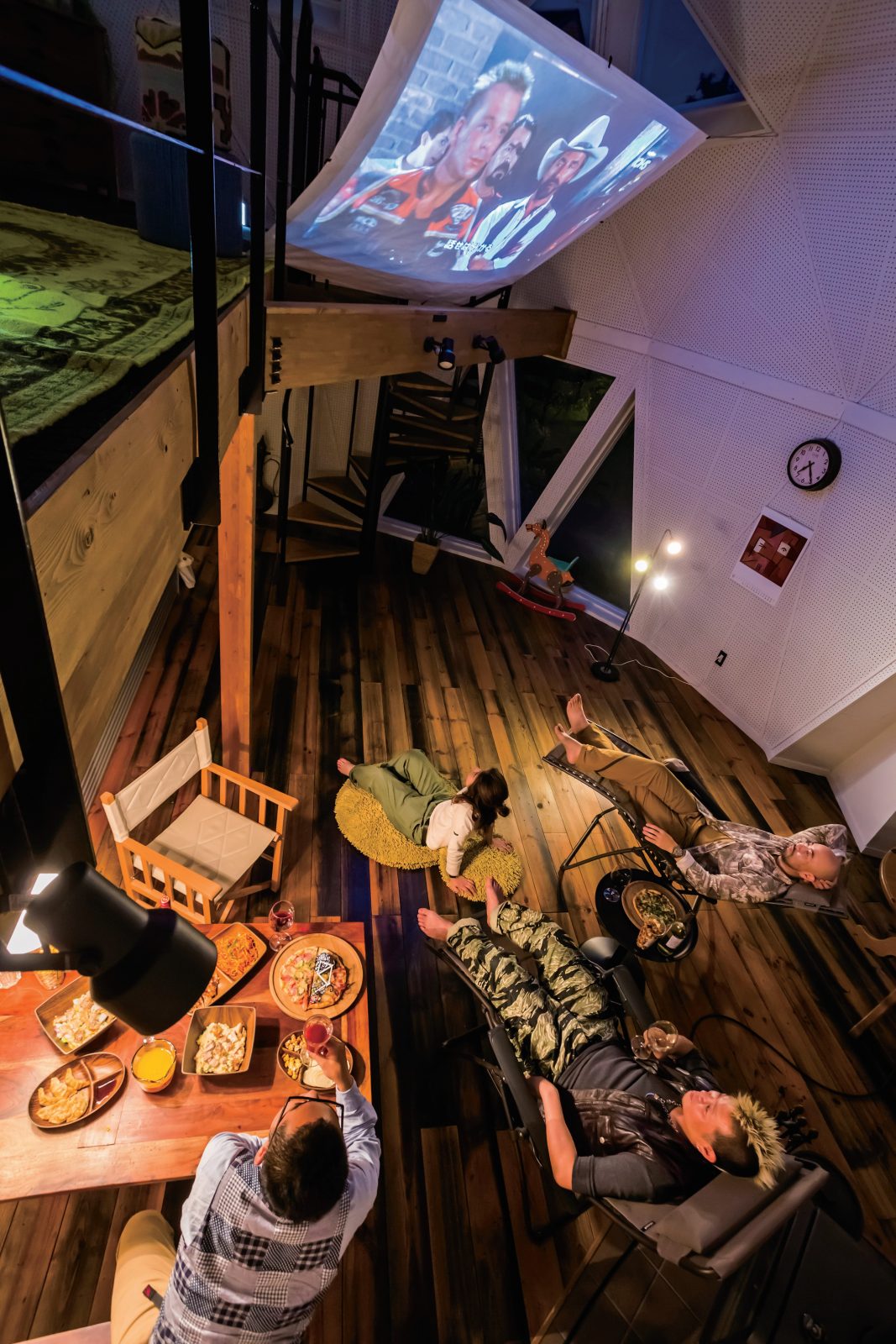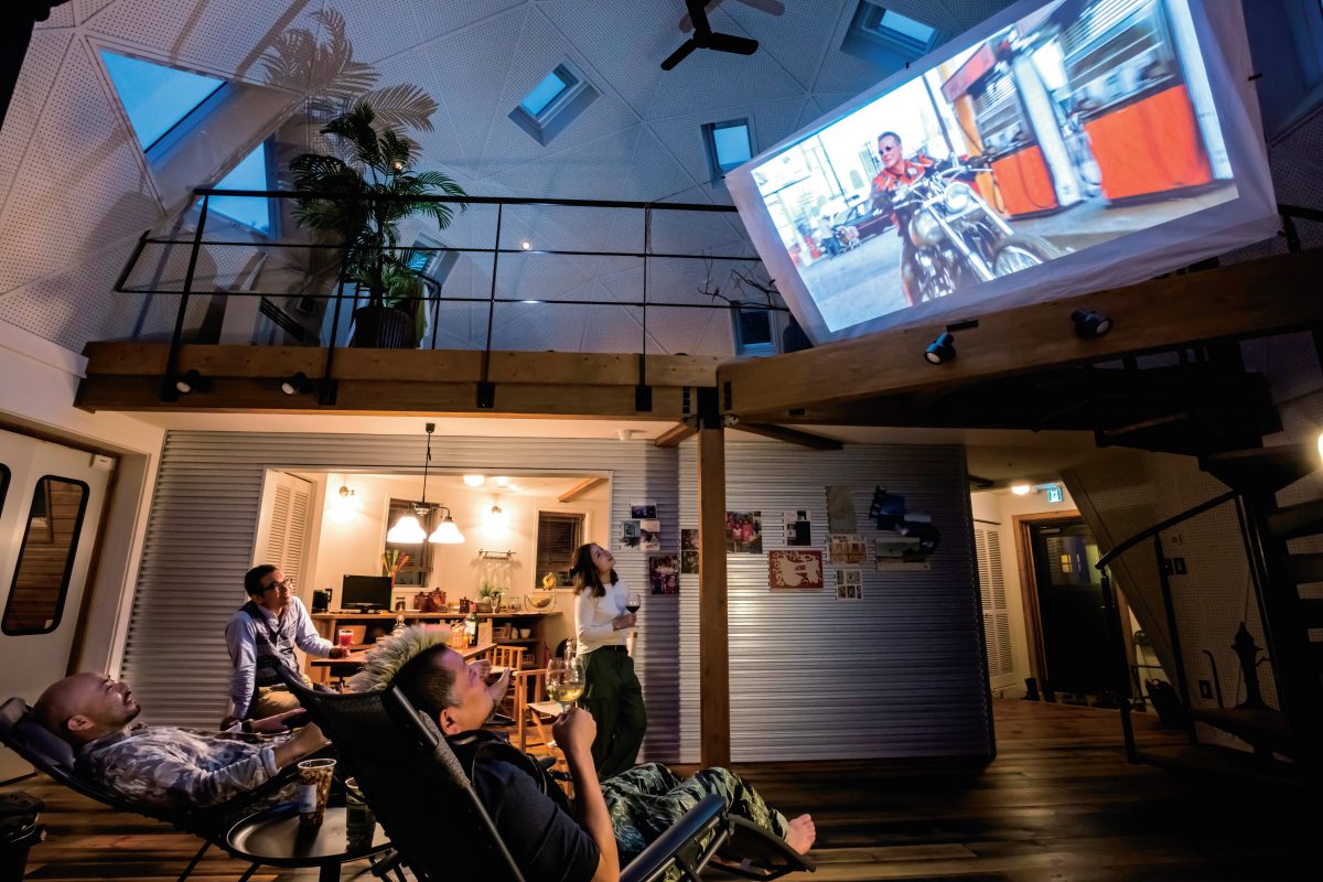 2階ロフト部分にスクリーンを張って、そこにプロジェクターで映画を投影した、人呼んで「ドームシアター」!