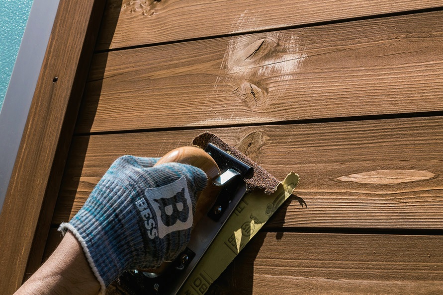 ログ材の節など突起している部分やヤニをヤスリがけして平らにしていく。主には見た目のためだが、平らな方が塗料もムラになりにくいのだ。
