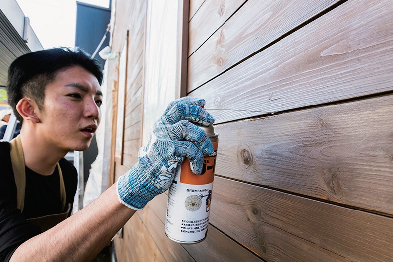 ログ材の継ぎ目など、水や汚れが溜まりそうな場所には、防腐スプレー「ガードン」を吹き付ける。撥水性があり、木材がより長持ちする。